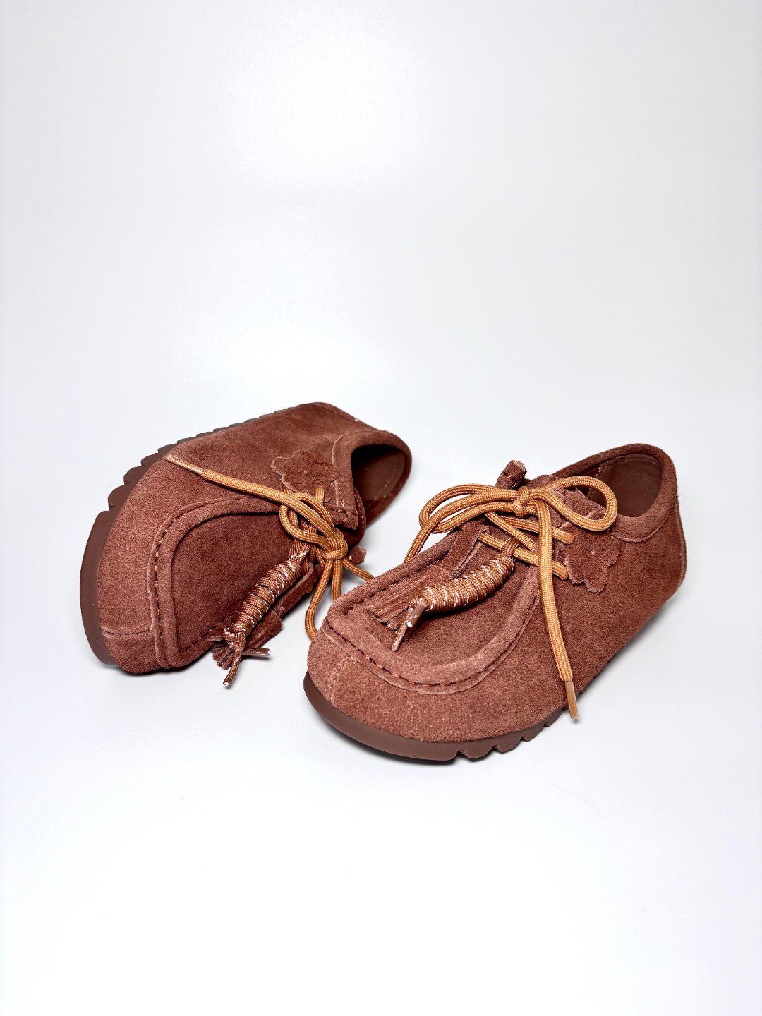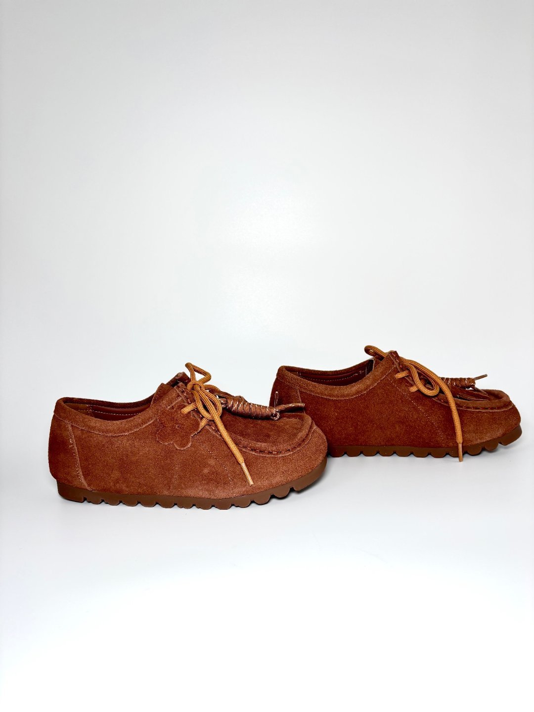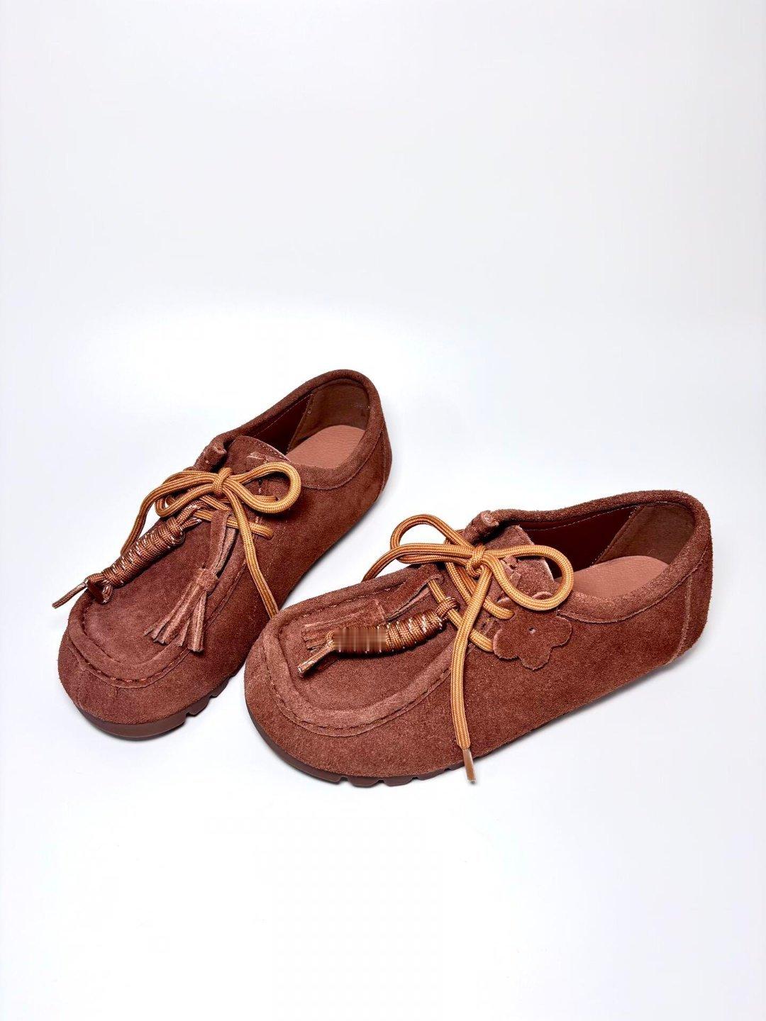 这双棕褐色麂皮乐福鞋长在了我的审美上,软乎乎的麂皮质感自带温柔滤镜,鞋头的编织流苏+系带设计添了复古细节,侧边的小花压纹又藏着点甜。
