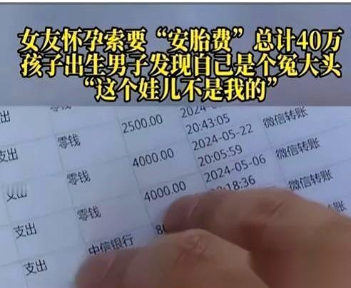 我真是活久见了。 40万。一个男人,为了所谓的“安胎费”,陆陆续续给女友转了40
