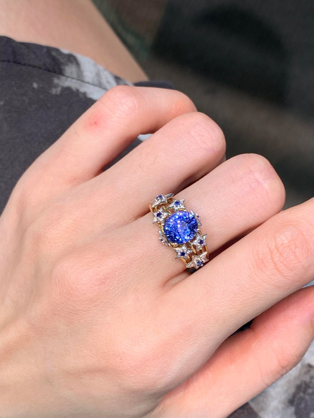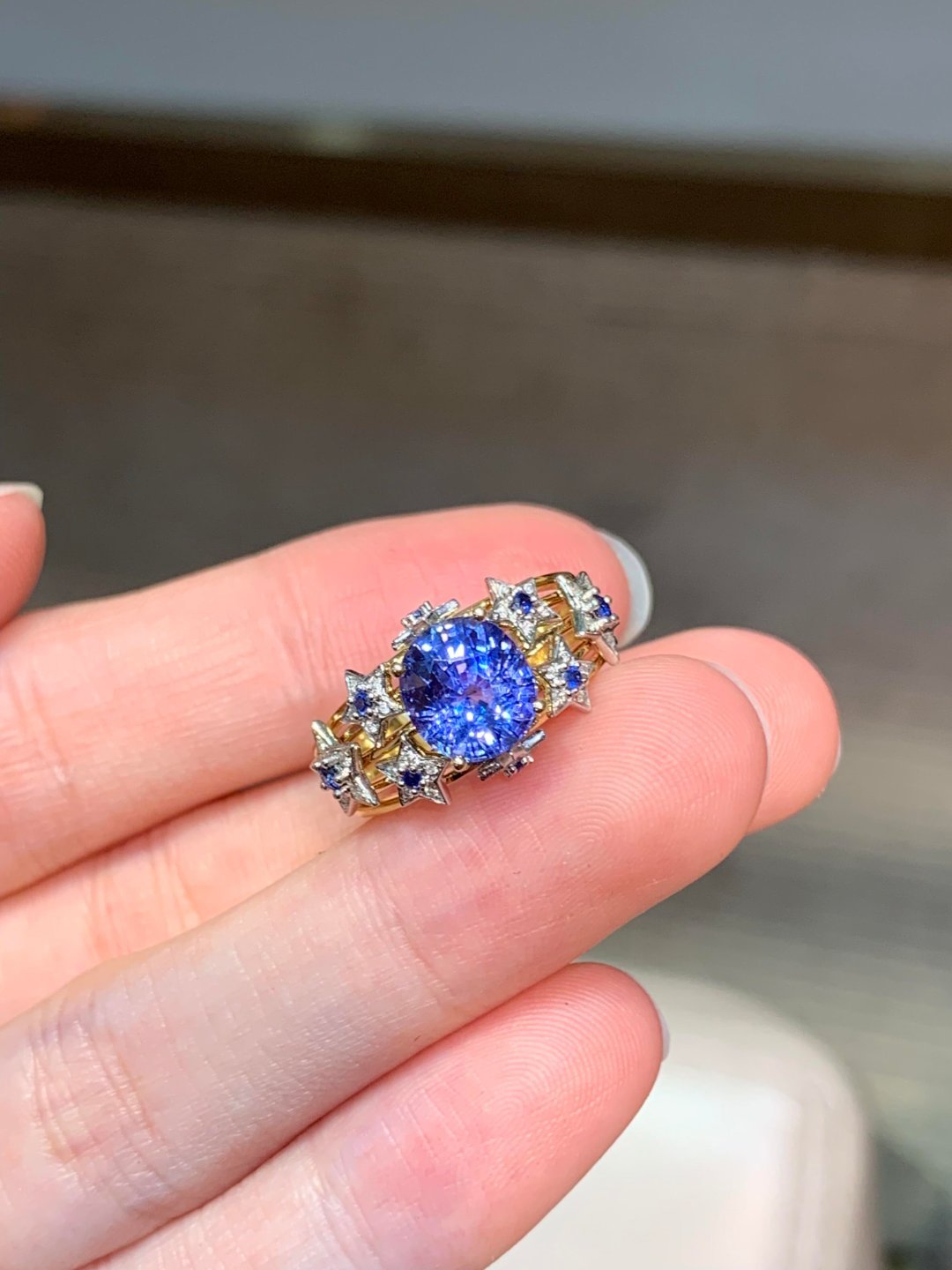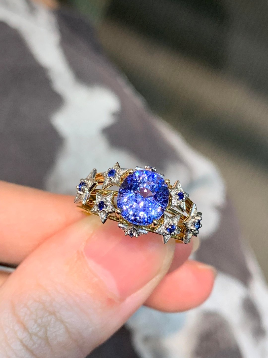 这枚戒指像把银河揉进了指尖,浓郁的矢车菊蓝蓝宝石,澄澈又透亮,周围的星星造型镶满小钻与碎蓝宝石,金镶边衬得整个设计更灵动。