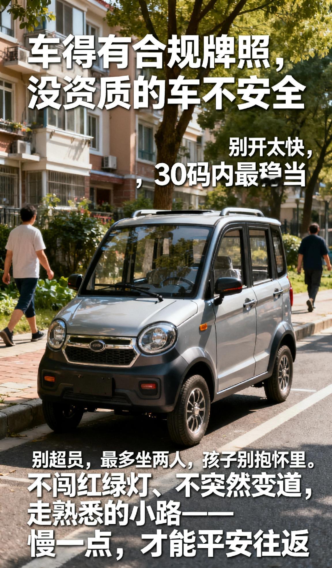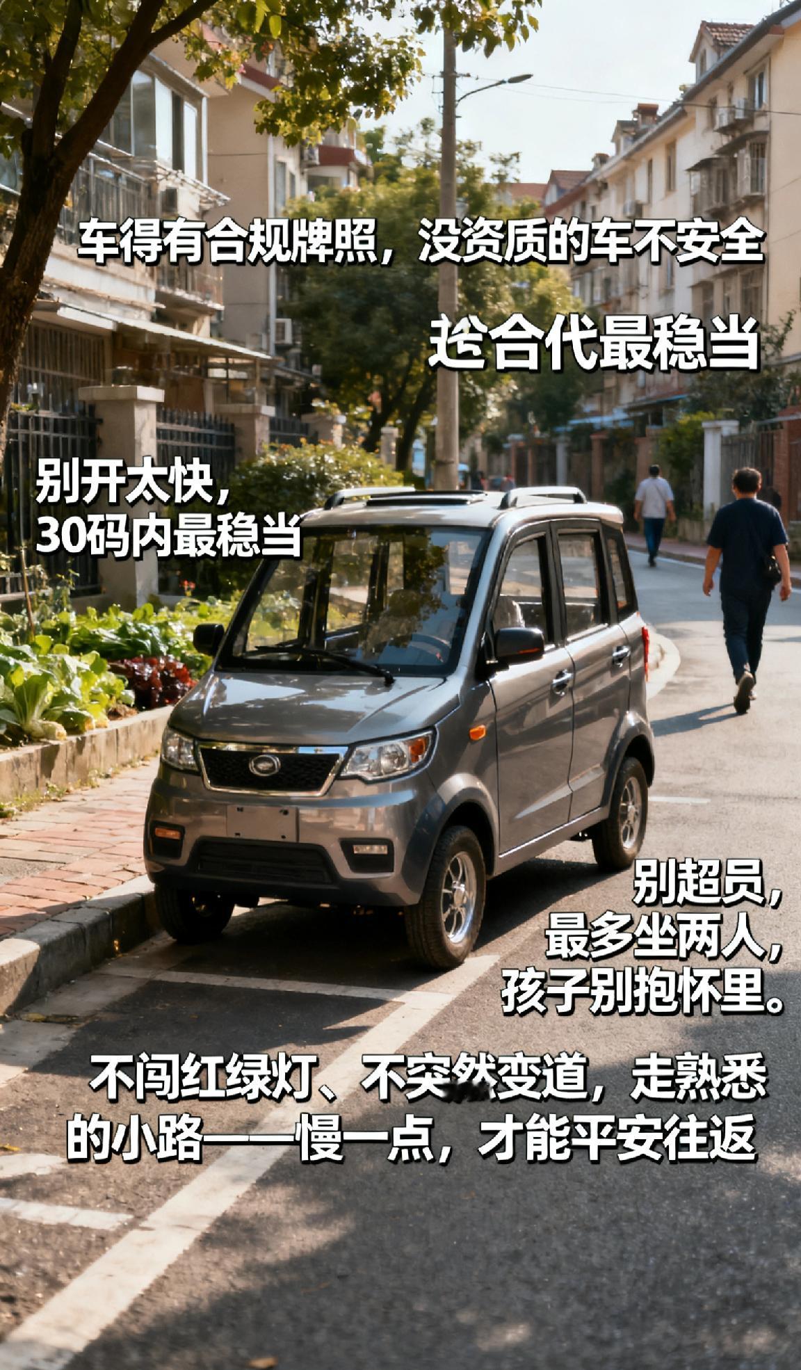 老年代步车,上路该注意哪些问题‘老年代步车买个菜、接孩子常用,上路注意这几件事:车得有合规牌照,没资质的车不安全;别开太快,30码内最稳当;别超员,最多坐两人,孩子别抱怀里;不闯红绿灯、不突然变道,走熟悉的小路——慢一点,才能平安往返。 老年人代步车 四轮老年车 老人接娃代步车