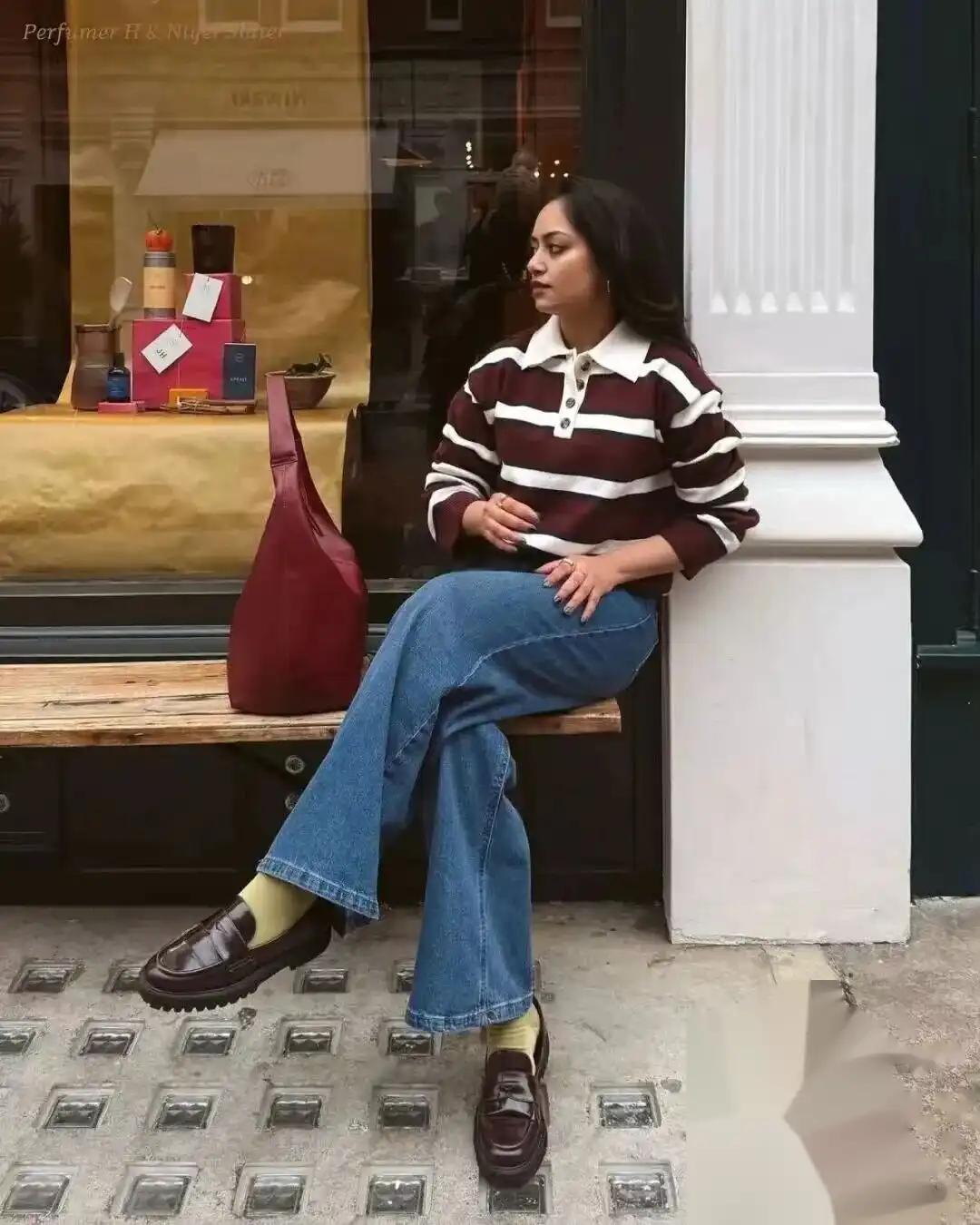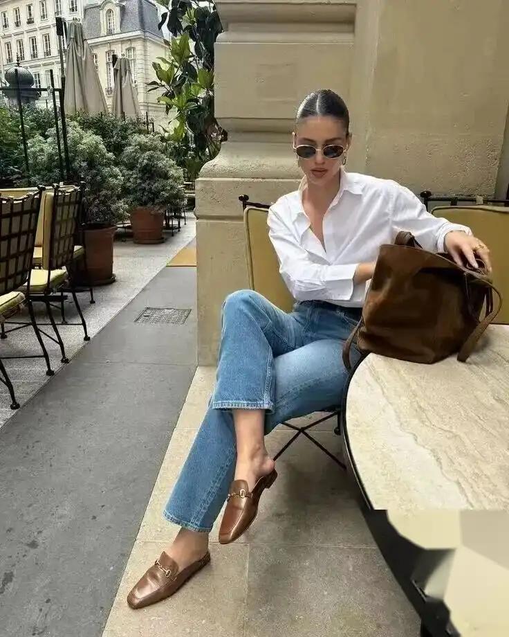 在牛仔裤和乐福鞋的搭配中,经典的黑色、白色和棕色永远不会出错,这些颜色非常百搭,可以与各种颜色的上衣和外套进行搭配。