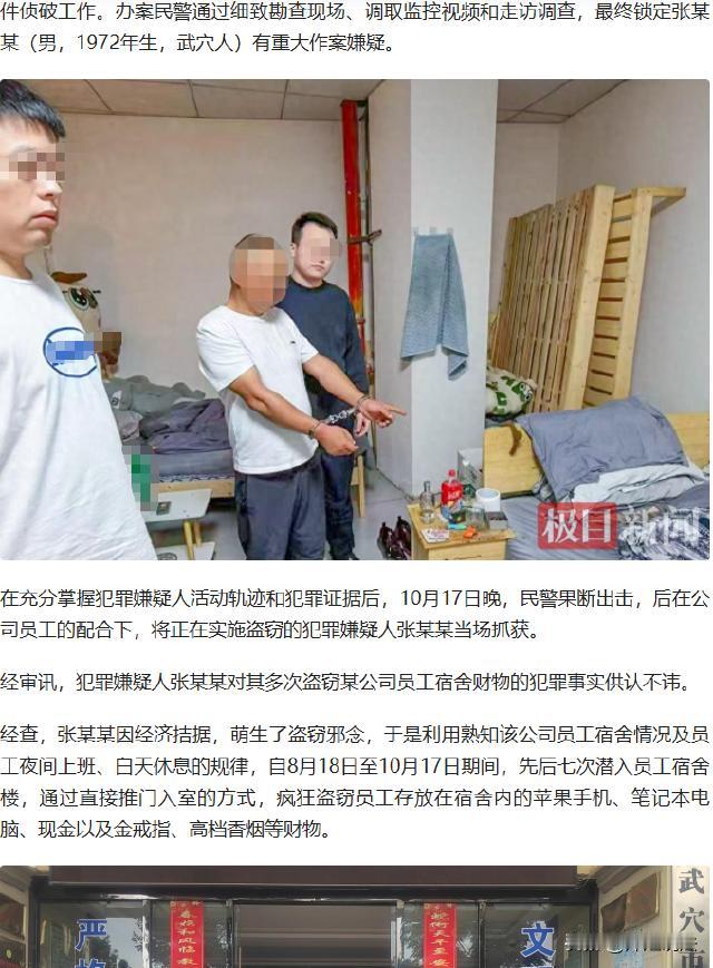 湖北武穴,有一公司员工宿舍,频遭盗窃,手机电脑现金等被盗,民警经勘查、调监控、走访锁定嫌疑人张某某,张某某第七次作案时被当场抓获,张某某称因经济拮据作案,已被刑拘。 从8月18号开始,该公司的员工宿舍就没消停过,隔三岔五丢东西,手机、笔记本电脑、现金,还有金戒指、高档香烟啥的,全被洗劫过。 民警接到报案后,是一点不敢马虎,勘查现场、调监控、走访调查。 经过一番侦查,锁定了嫌疑人张某某,这人是武穴本地人,1972年生,民警们心里有数了,就等着这小子再露头。 10月17号晚上,张某某又跑到员工宿舍楼,准备再干一票,这可是他第七次来了。 他刚摸进一间宿舍,正翻得带劲,突然,灯光大亮,一群人冲了进来。 张某某抬头一看,是民警,还有公司员工。 原来,民警早就埋伏好了,就等他上钩。 公司员工小王,当时就在旁边,大喊一声,抓住这贼! 大家一拥而上,把张某某按在地上。 张某某还想挣扎,嘴里嘟囔着,放我一马,我下次不敢了。 民警冷笑一声,还下次?你这次都跑不了! 经过审问,张某某交代,他是因为经济拮据,走投无路,才起了盗窃的邪念。 他说,家里老人需要钱,孩子上学也要钱,自己实在没办法了。 可再难也不能违法,这可不是解决问题的办法。 目前,张某某因为涉嫌盗窃罪,已经被刑事拘留,案件还在进一步侦办中。 那么,张某某的行为,触犯哪些法律? 根据《刑法》第二百六十四条规定,盗窃公私财物,数额较大的,或者多次盗窃、入户盗窃、携带凶器盗窃、扒窃的,处三年以下有期徒刑、拘役或者管制,并处或者单处罚金;数额巨大或者有其他严重情节的,处三年以上十年以下有期徒刑,并处罚金;数额特别巨大或者有其他特别严重情节的,处十年以上有期徒刑或者无期徒刑,并处罚金或者没收财产。 张某某,从8月到10月,先后七次进入公司员工宿舍盗窃手机、电脑、现金等财物,符合“多次盗窃”的情形。 张某某盗窃的财物包含手机、笔记本电脑等具有一定价值的物品,若累计数额达到当地规定的“数额较大”标准,就完全契合该法条规定的犯罪构成要件。 张某某的行为,是否构成盗窃罪呢? 盗窃罪的构成需满足,行为直接故意,且具有非法占有的目的,具有为实施秘密窃取公私财物,数额较大或者多次盗窃、入户盗窃等行为。 张某某明知盗窃他人财物是违法行为,仍出于非法占有员工宿舍财物(手机、电脑、现金等)的目的,多次实施盗窃行为,符合盗窃罪的构成条件。 他七次进入员工宿舍,在他人不知情的情况下,秘密窃取财物,其行为符合盗窃罪客观方面“多次盗窃”的特征。 张某某将受到什么样的处罚? 由于张某某属于多次盗窃,且盗窃财物若达到“数额较大”标准,依据《刑法》第二百六十四条,他可能面临三年以下有期徒刑、拘役或者管制,并处或者单处罚金的处罚。 张某某声称因经济拮据、家庭困难才实施盗窃,希望得到从轻处理。 法律面前,人人平等,家庭困难,不能成为违法犯罪的理由。 最终判决的依据在于,以事实为依据,以法律为准绳。 张某某说是因为经济困难才盗窃,可这就能成为他违法的理由吗? 等待他的,将是三年以下的有期徒刑、拘役或者管制,并处或者单处罚金的处罚。 您对这件事有什么看法呢? 信息来源:男子潜入员工宿舍盗窃手机、电脑、香烟,第七次伸手被现场抓获 2025-10-21 08:51·极目新闻