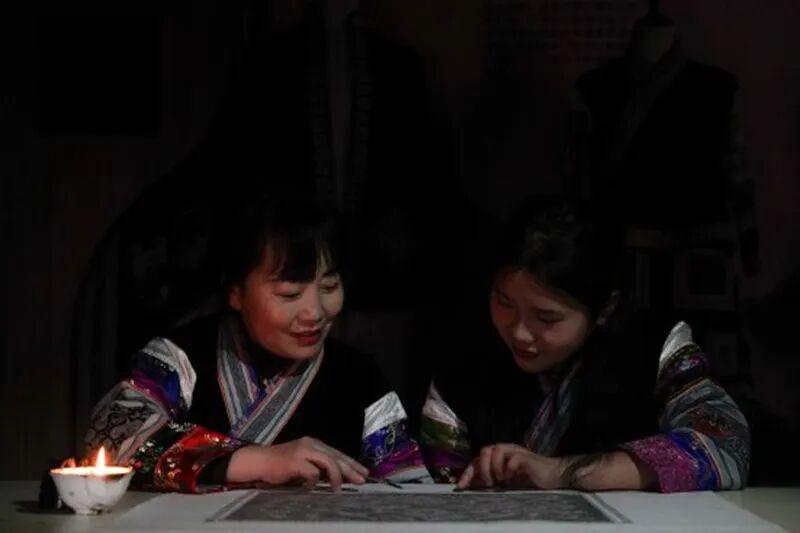 织金县蔡群苗族蜡染刺绣有限公司总经理蔡群指导绣娘制作蜡染工艺品