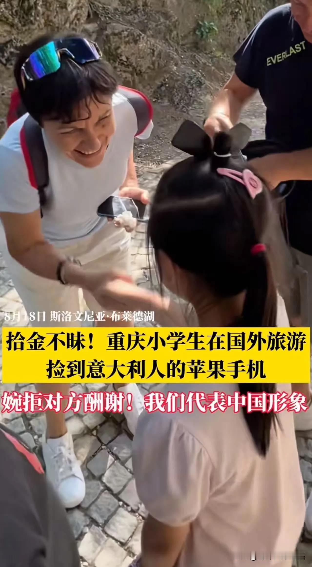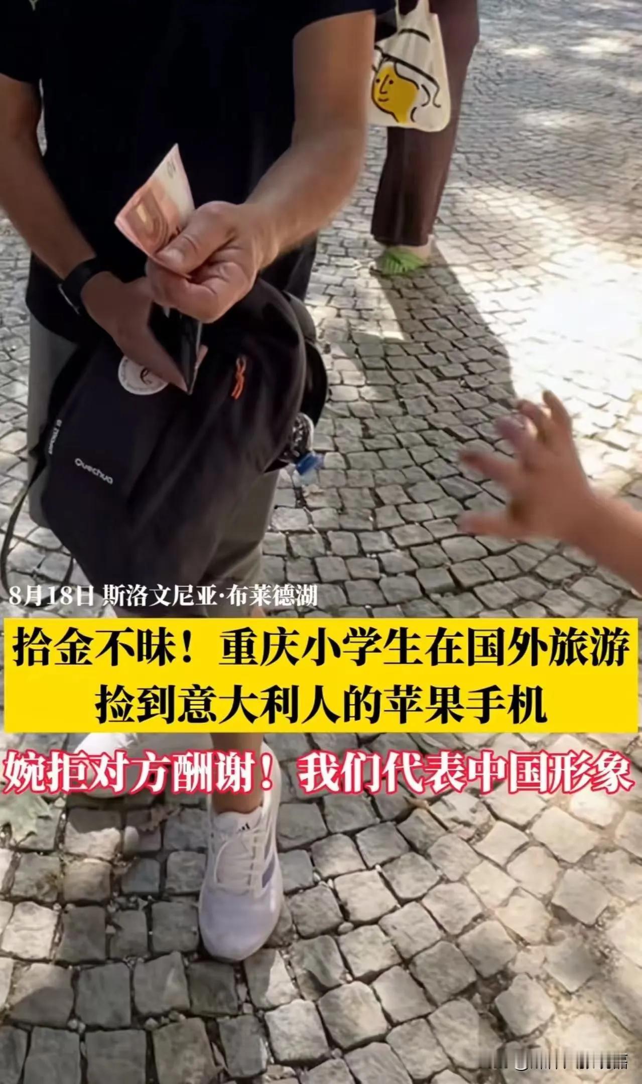 “这个小学生太给国人长脸了!”重庆icon小学生在国外旅游,捡到意大利icon游客掉的手机。而对方本以为手机找不回了,却没想到小女孩一直站在原地等他们!更让人意想不到的是,当意大利游客拿出100欧元表示感谢时,小姑娘婉拒报酬说:“在中国,我们拾金不昧!” 这位重庆的小学生真是太了不起了!在异国他乡依然坚持诚信,坚守“拾金不昧”的传统美德,充分展现了中国小学生良好的品德风貌。这样的行为不仅感动了意大利游客,也为中国青少年的良好形象添光加彩,是值得我们每个人学习的榜样!重庆小女孩
