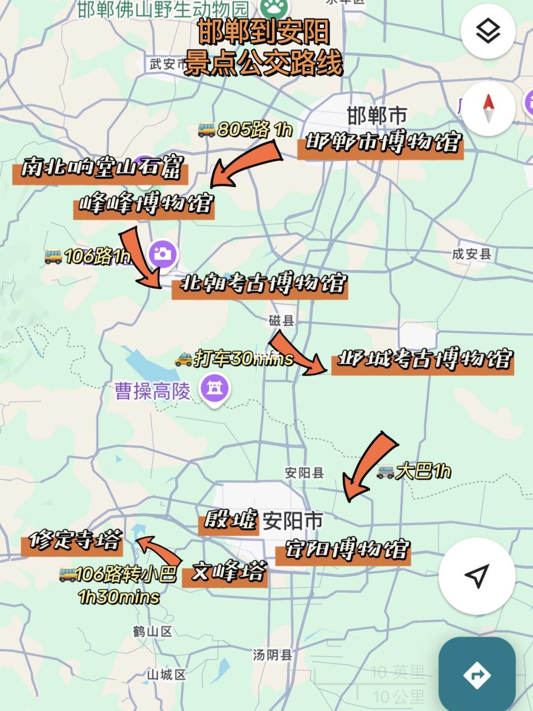 一千四百年后,回到北齐。我抬起头是条吞噬星河的巨蟒盘旋于高洋墓顶。我低头看是麴庆“星河不旦,岁月徒春”的情书。修定寺塔上的琉璃天女从未停止胡旋舞蹈,而站在南北响堂之巅,我仍然能听到北齐工匠崖壁开凿的第一声回响。 . 我们常常以“嗜杀成性,好色成瘾”来形容北齐。但不得不承认这个仅存在28年的禽兽王朝在艺术长河里曾留下了浓墨重彩的一笔。 - 📝四日北齐访古路线: d1:邯郸市博物馆➞南北响堂山石窟➞峰峰博物馆 d2:北朝考古博物馆➞邺城考古博物馆➞安阳博物馆 d3:修定寺塔➞天宁寺文峰塔➞中国文字博物馆 d4:殷墟博物馆➞殷墟 - 📷景点信息: 响堂山 响堂山石窟以南北两大石窟及常乐寺为一体三部分。南响堂虽小却拥有仅存的三件北齐原物头部造像。北响堂为皇家开凿,也有传闻是为高欢陵穴。有“东方维纳斯”之称的斜侍菩萨直接影响了隋唐以后的菩萨造像。 - 磁县与临漳 古时邺城今时临漳,八大名瓷的磁州窑便产于此。“铜雀深闺锁二乔”的铜雀台及兰陵王高长恭之冢虽已只剩土台。但巨蟒吞噬银河的高洋墓及惊世的北齐佛造像都能在北朝、邺城两大顶级考古博物馆内找到。 - 殷墟博物馆 殷墟的出土直接将中国历史向前推进3300多年。馆内数以千计的甲骨卜辞及青铜器毫不夸张地说可以看到生厌。 - 安阳市博物馆 比起殷墟,安阳市博可以说是难得的清静好去处。馆内的麴庆及夫人墓攒足了看点。除了精美的浮雕石棺,“星河不旦,岁月徒春”、 “晨鸡不旦,陇树恒秋”这两句墓志铭也成为了千古最美情书。 - 修定寺塔与文峰塔 安阳市内的地标天宁寺文峰塔始建于五代,呈独特的伞型,塔身八面壁上饰有佛画故事砖雕工艺精湛。而市外的北齐疯王家塔修定寺塔,因其四周的将军、武士、天女、动物花卉等琉璃浮雕生动逼真,而被誉为中华第一华塔。 - ⚠️一些tips: ❶本篇路线着重于北齐访古,邯郸及安阳还有很多其他景点 ❷以上目的地均可通过公共交通抵达,具体可参考路线图 ❸如果时间充足可以在行程列表加上北齐灵泉寺及小南海石窟。 .