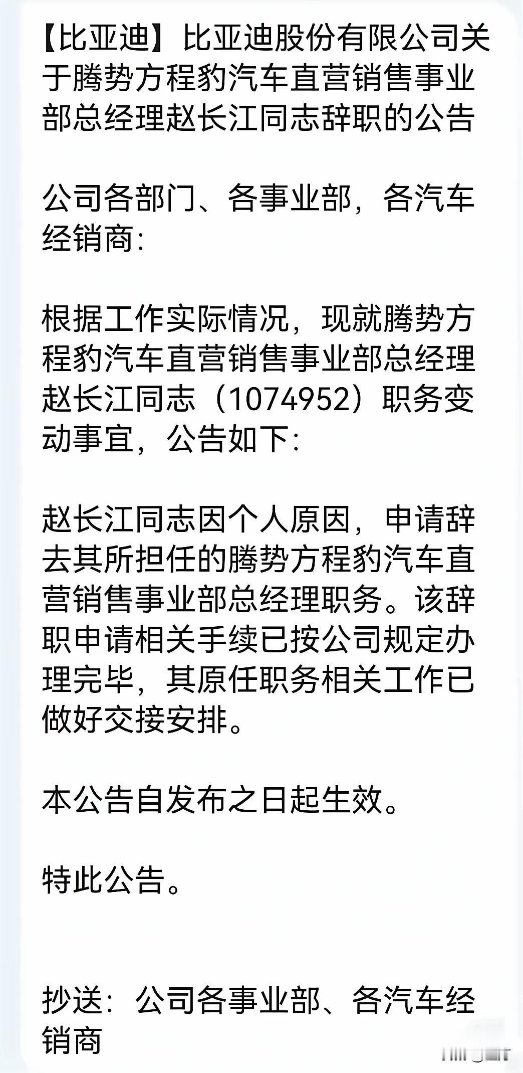 比亚迪赵长江离职在于他跟腾势的气质不搭 他走是必然的 腾势这个品牌和产品力比新势力强太多了 怎么就做不起来? 少了点情绪价值 情绪价值这块他赵长江给不了 什么“明年20万台,BBA之后就是我”,看似有魄力,实则把腾势屈居于BBA之下,就冲这一点他就不适合做高管!