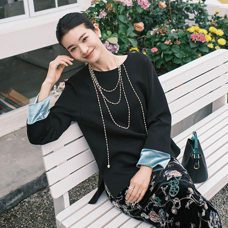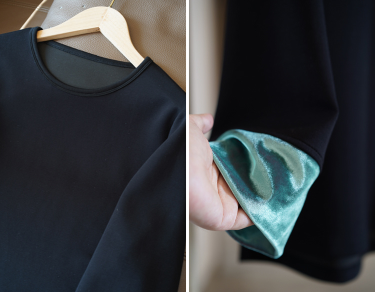 双袖间的翡翠绿色丝绒,远看是黑中的一抹点睛翡翠,近看却是翡翠底色透着酒红光泽。就像双腕绕翡翠,举手投足间都是优雅贵气!