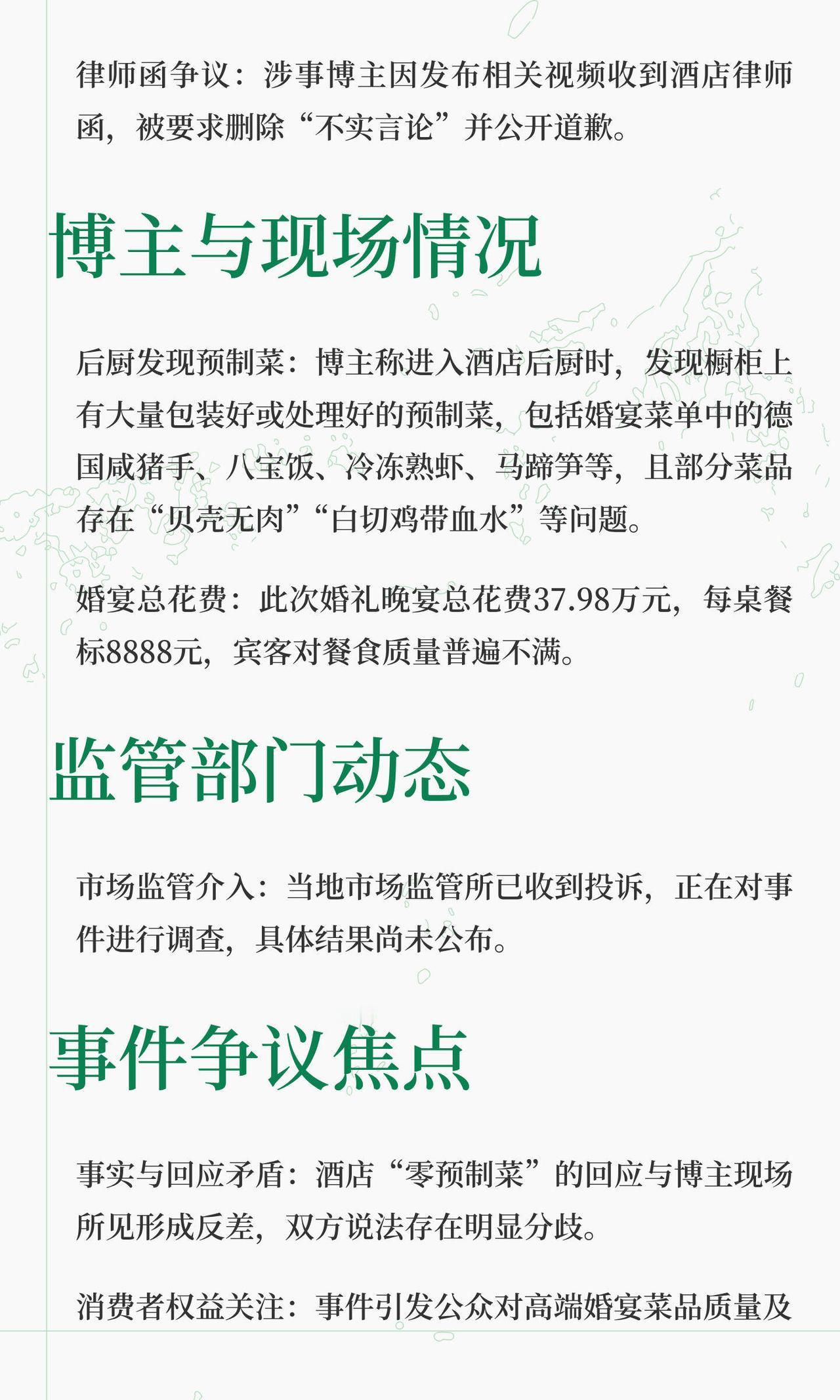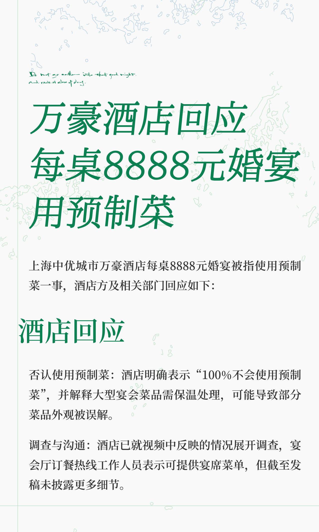 花38万吃预制菜。上海一对新人万豪办婚宴,8888元一桌的菜,结果端上来都是预制品:咸猪手是成品包装,八宝饭是安井牌,海鲜有壳没肉,白切鸡还带血丝。 更绝的是,爆料后新人反被酒店发律师函警告。酒店嘴上说调查,实际连菜单都不敢晒。 要我说,现在餐饮界套路太深。预制菜成本几块钱,加热一下就卖你几百。这不是做生意,这是把消费者当冤大头! 可以接受明码标价的预制菜,但绝不能接受挂现做的羊头,卖预制的狗肉。 有人说预制菜是趋势,明示价格实惠就行;也有人觉得高端宴席用预制菜就是欺诈。你怎么看?