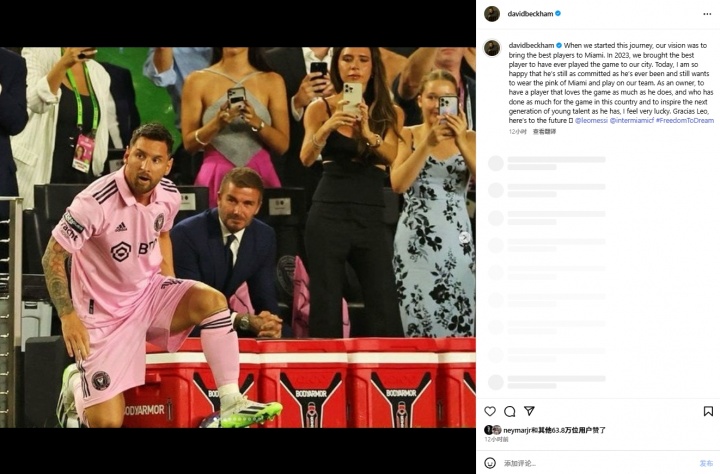 迈阿密国际老板之一的贝克汉姆发文祝贺梅西续约:当我们踏上这段旅程时,我们的愿景是将最优秀的球员带到迈阿密。