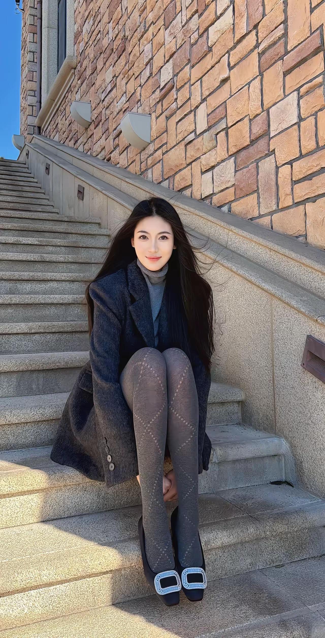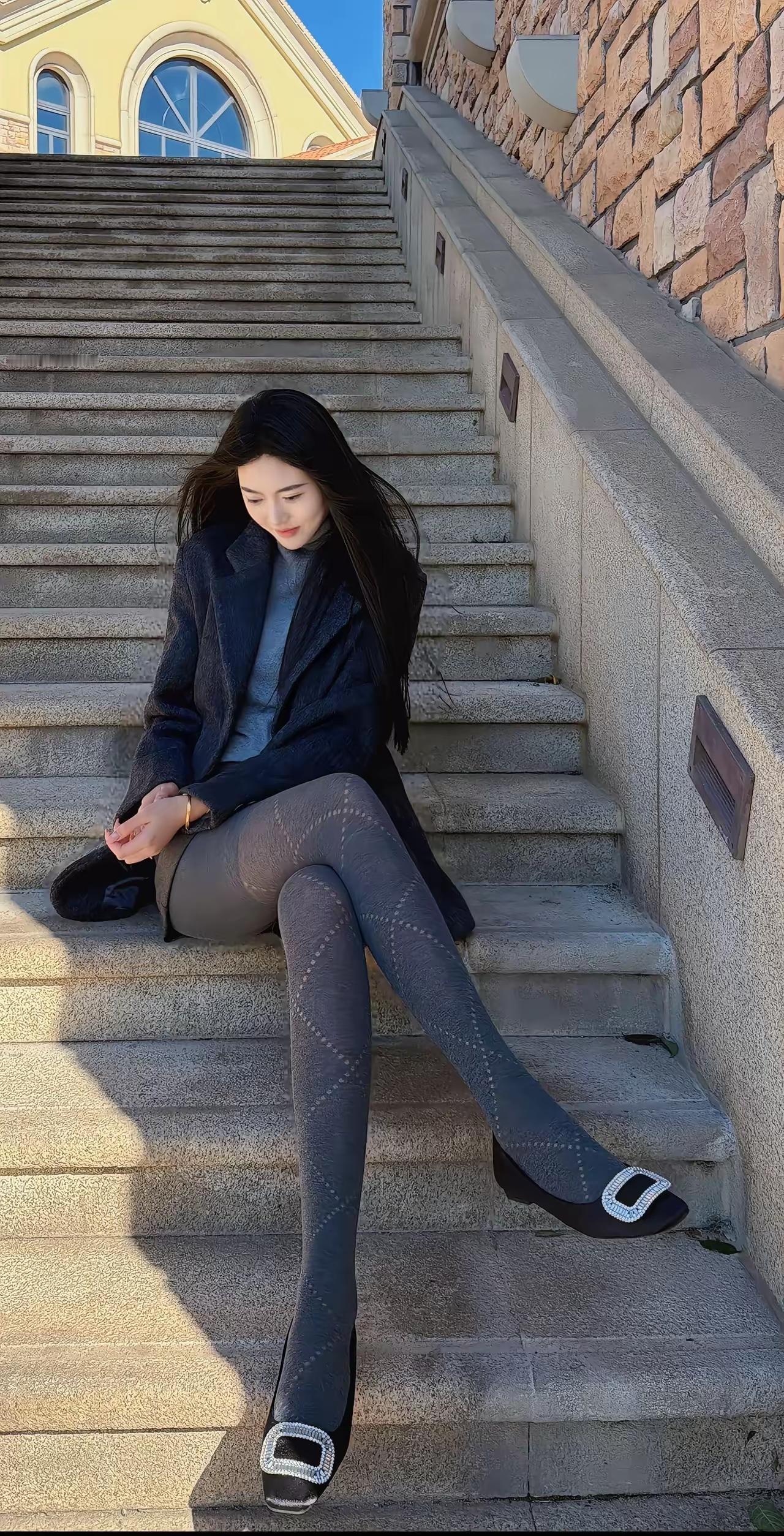 阳光下的优雅穿搭,坐在台阶上的时尚少女