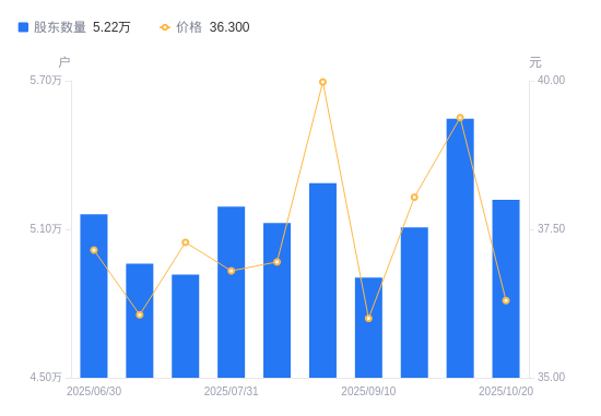 日期A股户数(户)流通A股户均持股数(股)户均持股市值(万元)2025-10-20521924457.6616.182025-09-30554634194.7616.522025-09-19510734555.3217.332025-09-10490494743.3017.082025-08-20528614401.2417.602025-08-08512524539.4216.772025-07-31519124481.7016.492025-07-18491744731.2417.642025-07-10496054471.2816.122025-06-30516104297.5715.97