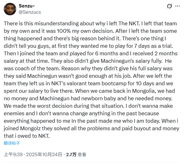 “关于我离开NKT战队的原因,一直存在误解。我是主动离开那支队伍的,这100%是我自己的决定。离开后确实发生了一些事,背后也有重要原因。有件事我之前没跟大家说过:一开始他们只让我试训7天,但后来我加入了战队,一共打了6个月,期间却只拿到了2个月的薪水。他们也没给Machinegun结清工资,他当时是战队的教练。至于没给全工资的理由,他们说Machinegun的工作表现不够好。我们离开战队后,被留在了NKT无畏契约战队的集训营里,一待就是10天,期间只能用自己的薪水支付食宿。等我们回到蒙古时,已经身无分文了。当时Machinegun刚有了新生儿,非常需要钱。在那种处境下,我们做了最糟糕的决定。我不想树敌,也不想改变过去的任何事——因为过去发生在我身上的一切,才造就了今天的我。后来我加入Mongolz战队,他们帮我解决了所有问题,不仅支付了转会费,还帮我还清了欠NKT的钱。”