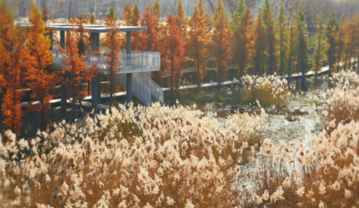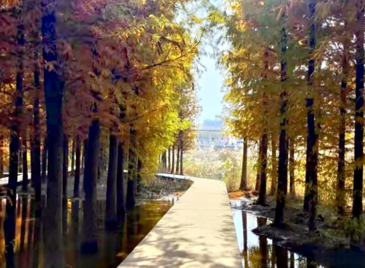 步入生态净水廊道,仿佛踏入了一个清水潺潺、秋光旖旎的秘境。漫步水杉的浅水步道,枝叶在秋风中轻轻摇曳,洒下一片片斑驳的光影,感受独有的静谧美好。