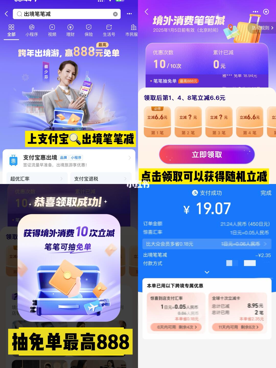 1月5号在境外支付前可以线上支付宝🔍【出境笔笔减】能领取10笔消费减免机会,首单、第四单、第八单都是必减6.6r,其他随机减💴还有免单的机会,最高可免888元,这要是中了就很nice~