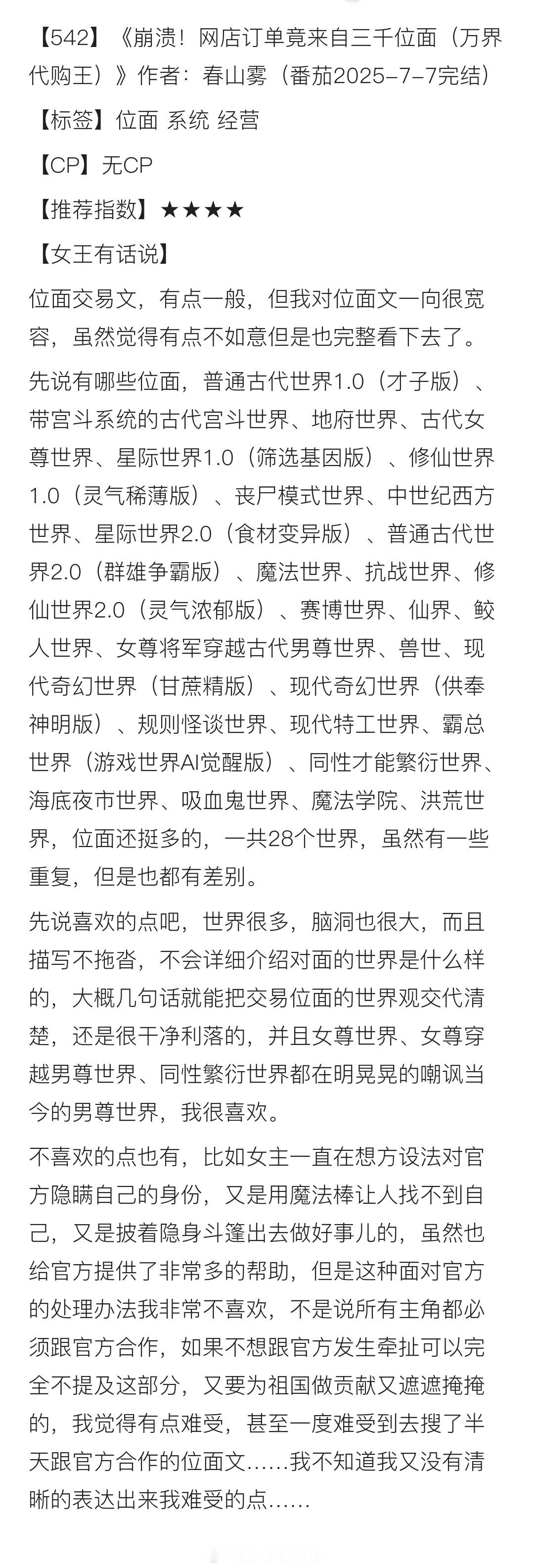 【542】《崩溃!网店订单竟来自三千位面(万界代购王)》作者:春山雾(番茄2025-7-7完结)