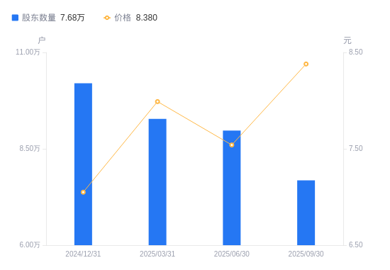 日期A股户数(户)流通A股户均持股数(股)户均持股市值(万元)2025-09-307683918447.1315.462025-06-308972515797.8211.912025-03-319277215278.9612.212024-12-3110199413897.489.802024-09-309615414741.559.382024-06-3010458213553.576.792024-03-3112560211285.327.282023-12-318490016695.639.082023-09-307506818879.7810.912023-06-307476618956.0513.74