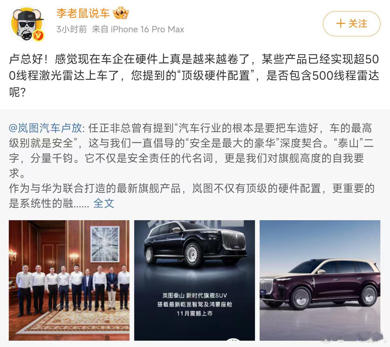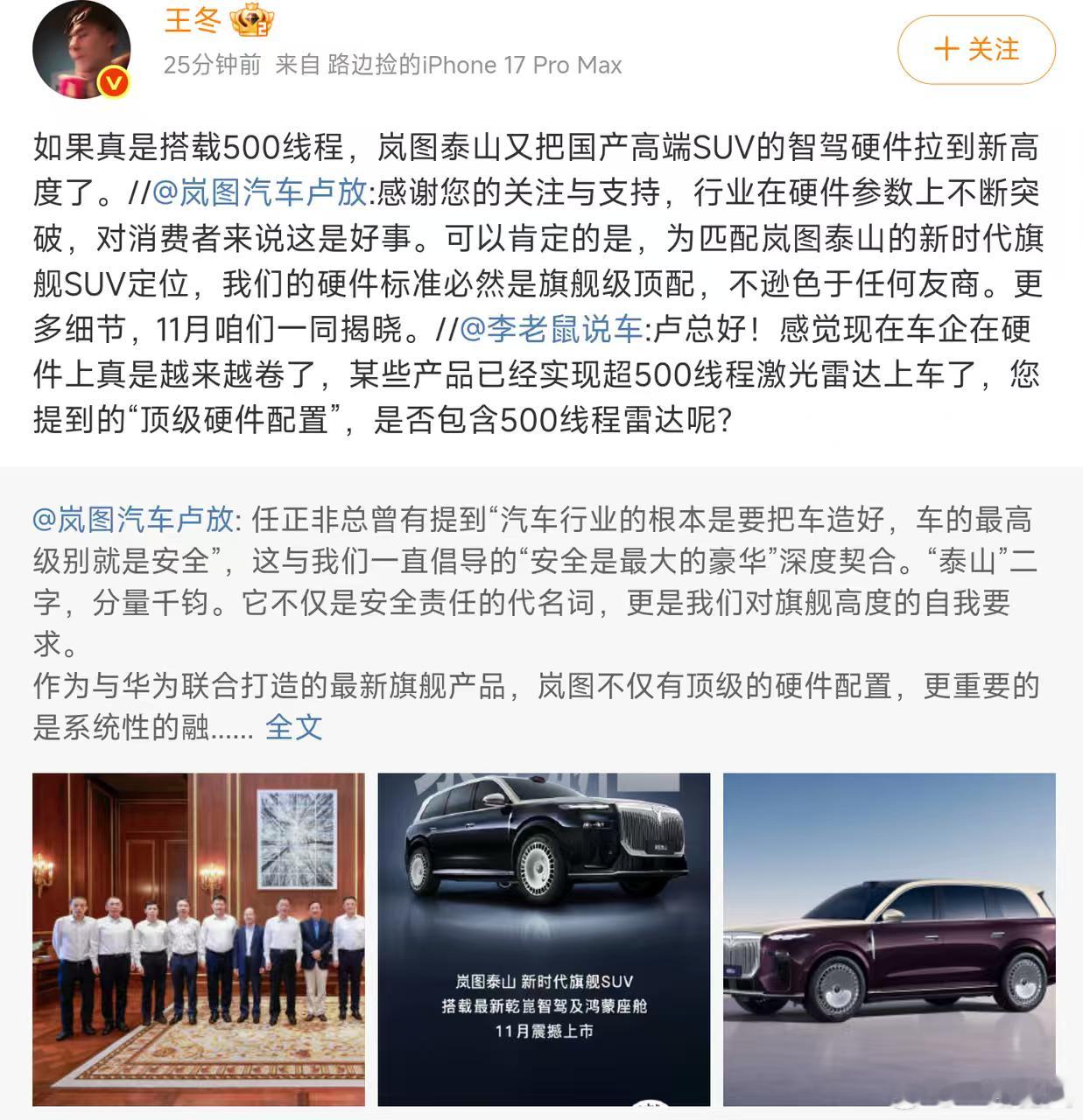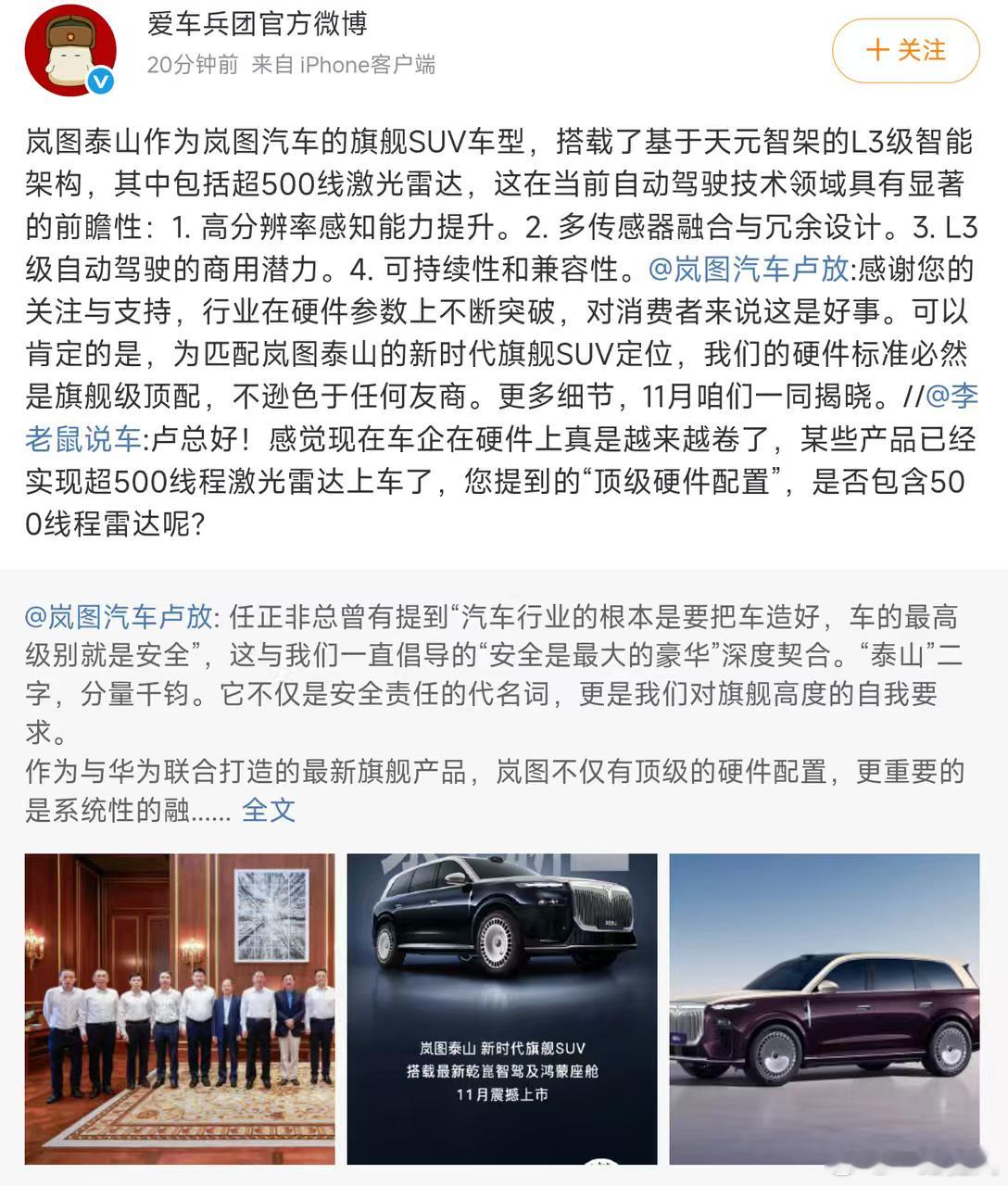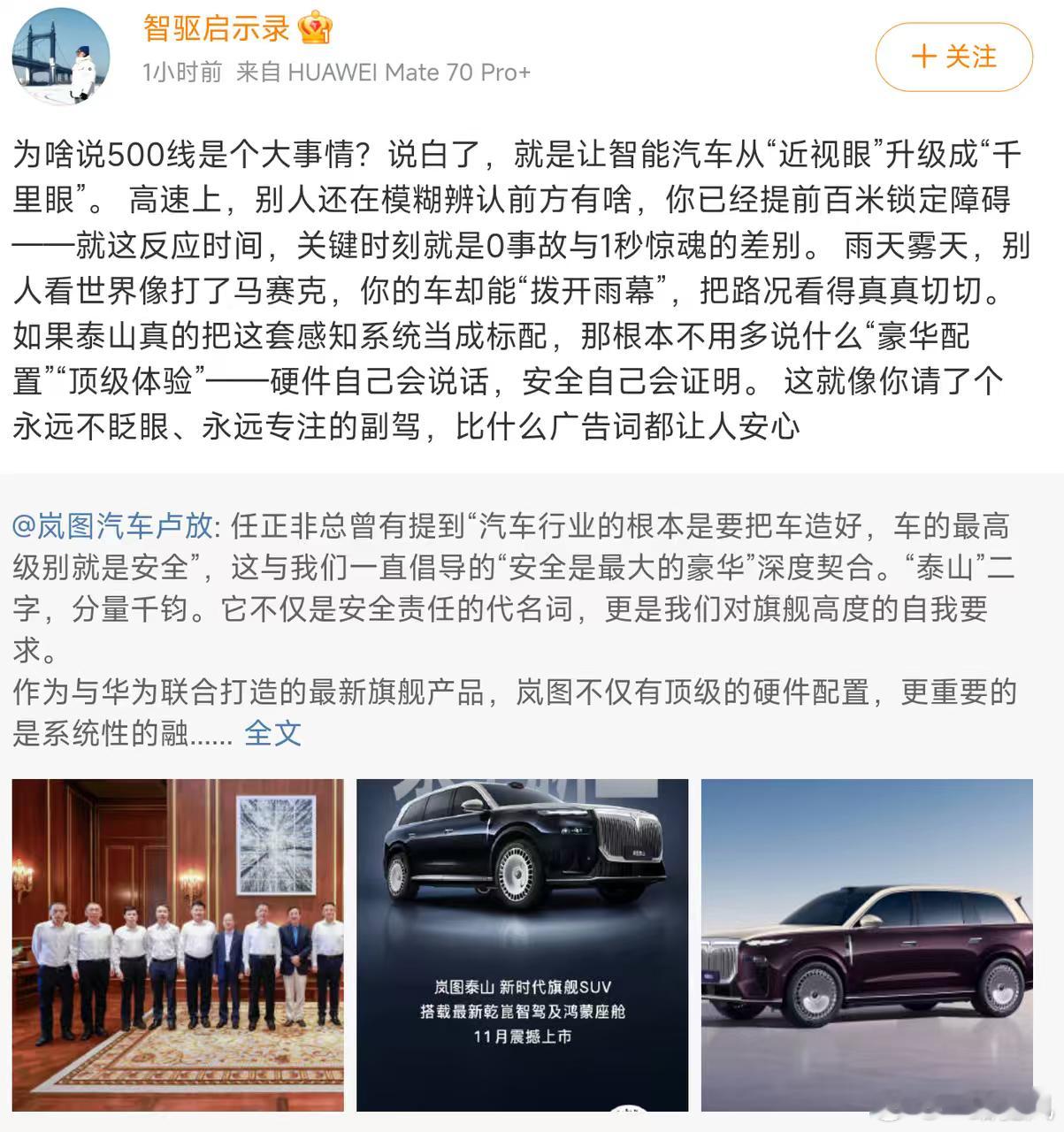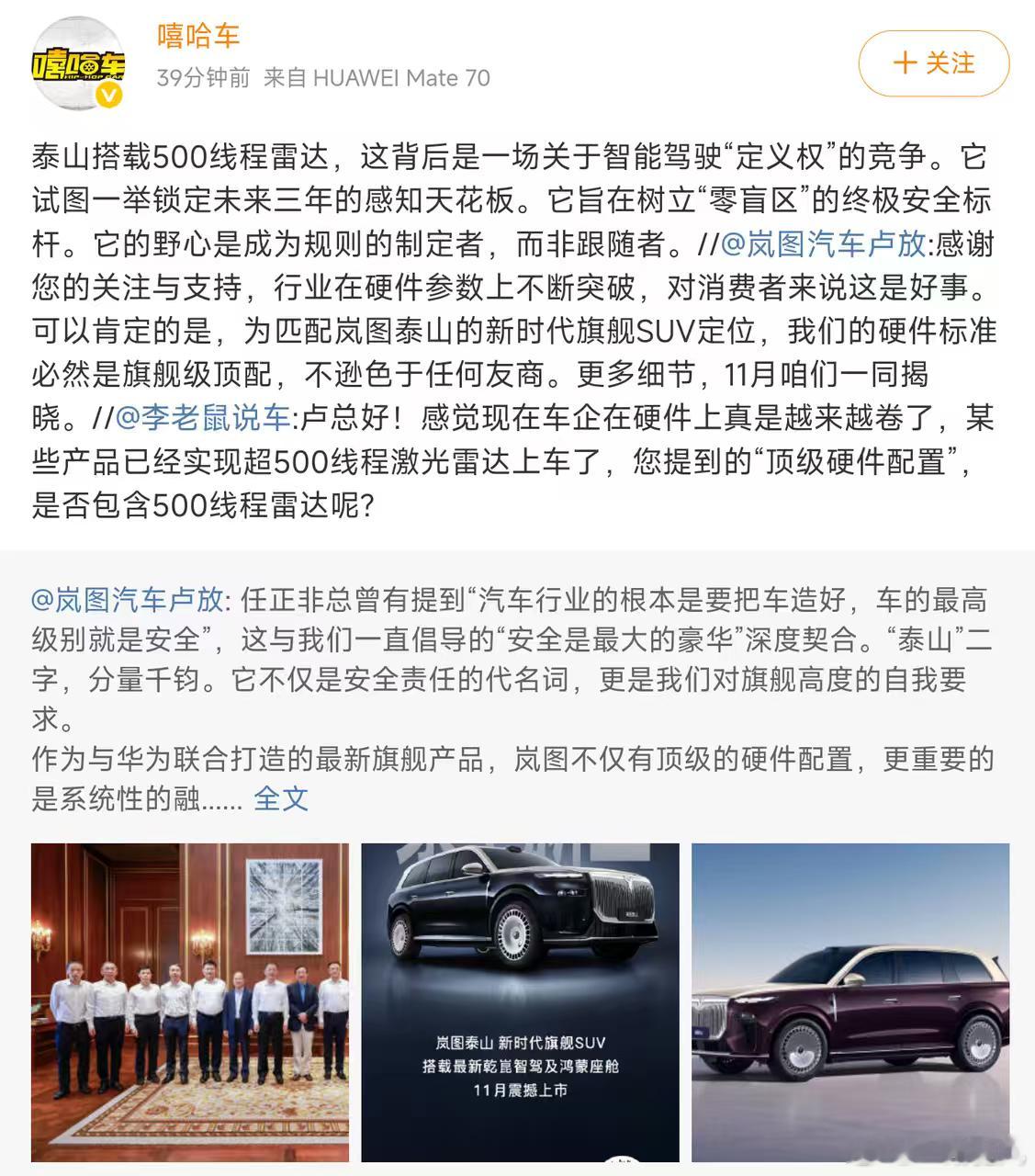 岚图汽车董事长卢放今日发布的一条微博在汽车圈内引起了广泛关注,看来这次岚图泰山是下足了功夫,500线?!简直就像给车辆装上了千里眼。这样一来,辅助驾驶的安全性将得到显著提升,真是广大车主的福音啊!