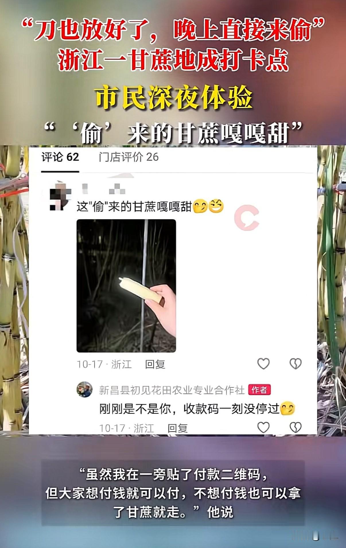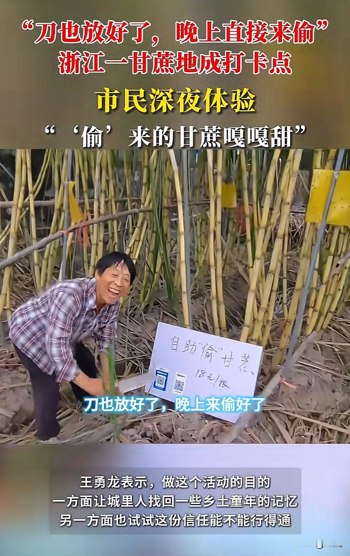 商业天才!浙江一个80后农民王勇龙,在甘蔗地里挂了块牌子,上面写“自助偷甘蔗,晚上7点到早上5点,18元一根”。还放了付款码和刀。 这个点子来自网友留言。有人在他视频下面说,想体验小时候偷甘蔗的刺激感。王勇龙直接满足了这群人的需求。 牌子立了20多天,100多人摸黑来“偷”。有意思的是,他明确说了“不想付钱也能直接拿走”,结果没人白拿,反而收了6000多块钱。 来体验的网友还挺入戏。有人晒“付一根吃三根”,有人说“做了一次不用紧张的贼”。这哪是买甘蔗,分明是买童年记忆。 有人嫌贵,王勇龙回应“玫瑰酵素种的,可以免费吃”。这话硬气,暗示我的产品值这个价。 他最近还给地里装了灯光,让夜间的“偷窃”更有氛围。这老板太懂现在消费者要什么了,卖的不仅是农产品,更是一种社交体验。 这种模式本质是场信任测试。一个月下来,所有参与者都自觉付款,说明人与人之间的诚信还在。 传统农业经常愁销路,这个80后农民用一个小创意就让产品供不应求。现代农业需要的不只是好产品,更是好创意。
