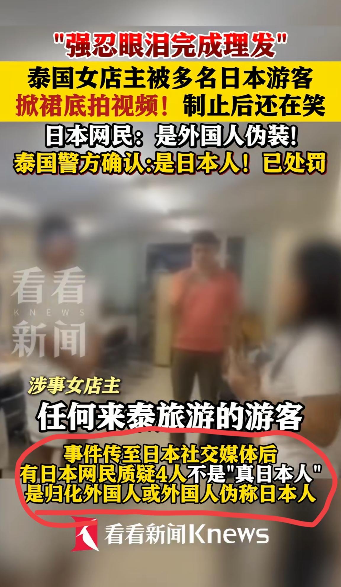 日本人的猥琐行为引爆泰国怒火。 在泰国旅游的4名日本人,要求34岁女老板理发,却趁机偷拍裙底。 女老板发现这是对方的陷阱时,愤怒制止,对方却毫无歉意。 视频传到日本媒体,日本民众的表现更是让人震惊。 它们不是表达歉意,反而上来甩锅这4人是别的国家伪装,根本不是日本人。 泰国警方无奈出来打脸:这四人确认都是日本人。 现在网络有一件怪事,一些亚洲素质地下的小国,国外丢人后首先做的不是道歉,而是居然发动水军诬陷亚洲某大国。 就像泰国人表达的那样:欢迎各国游客,但希望有点素质,有点尊重,有点担当。