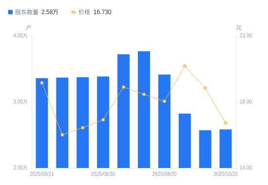 日期A股户数(户)流通A股户均持股数(股)户均持股市值(万元)2025-10-202584714380.9524.062025-10-102571914452.5227.232025-09-202823713163.7326.562025-08-203415010884.4619.642025-07-31376899862.4118.212025-07-20372269985.0718.872025-06-303385710978.6518.582025-06-103374811014.1118.112025-04-203369711030.7817.662025-03-313360411061.3121.20