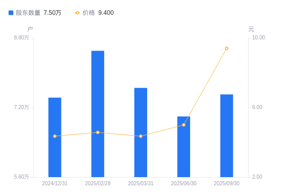 日期A股户数(户)流通A股户均持股数(股)户均持股市值(万元)2025-09-307500318664.8917.542025-06-306994920013.4710.012025-03-317648818302.517.962025-02-288503416463.097.522024-12-317427218848.598.202024-09-307401718913.538.252024-06-307451918786.117.122024-03-317799417949.107.652024-02-297991617517.427.762023-12-318100017282.999.70
