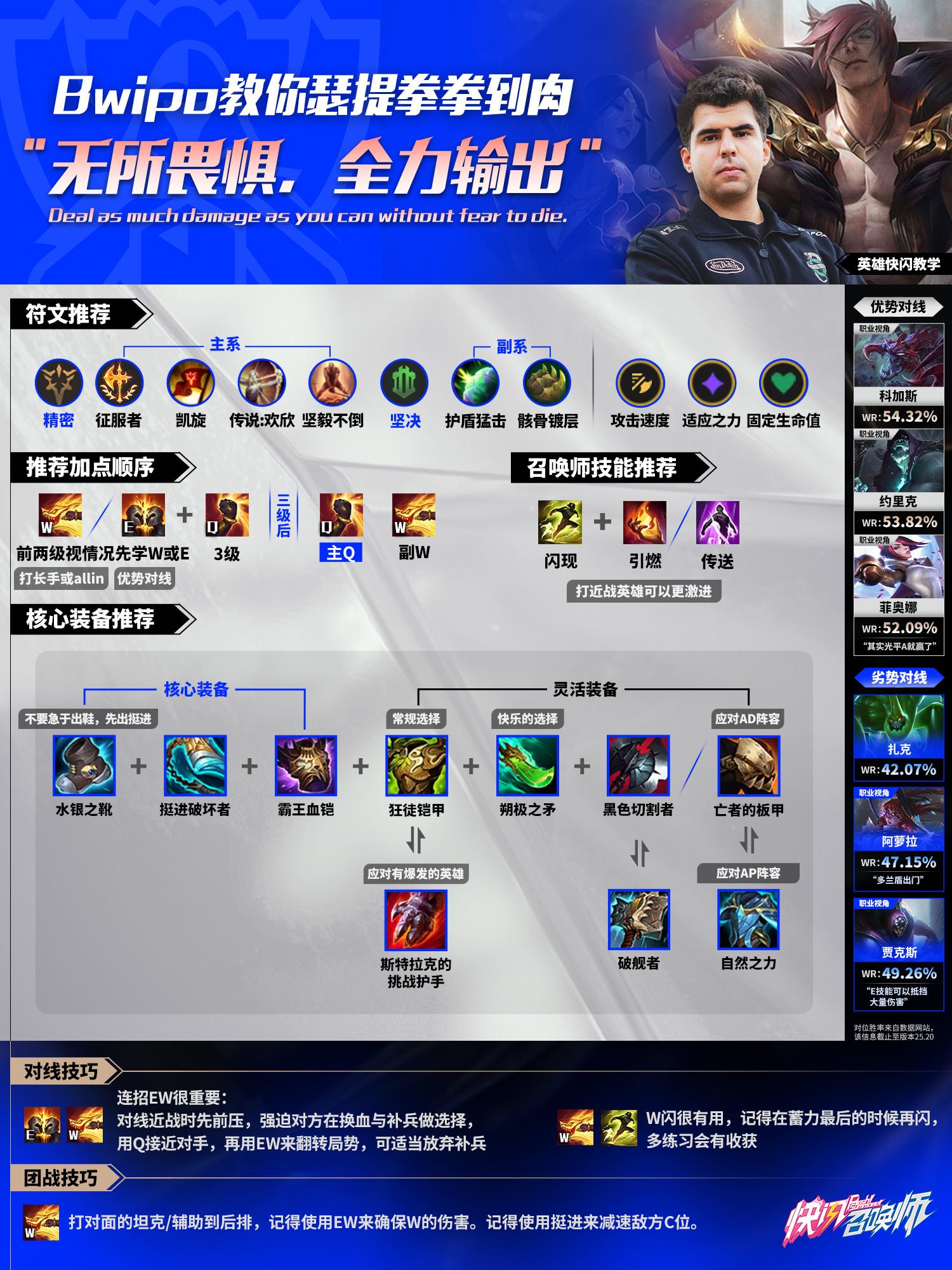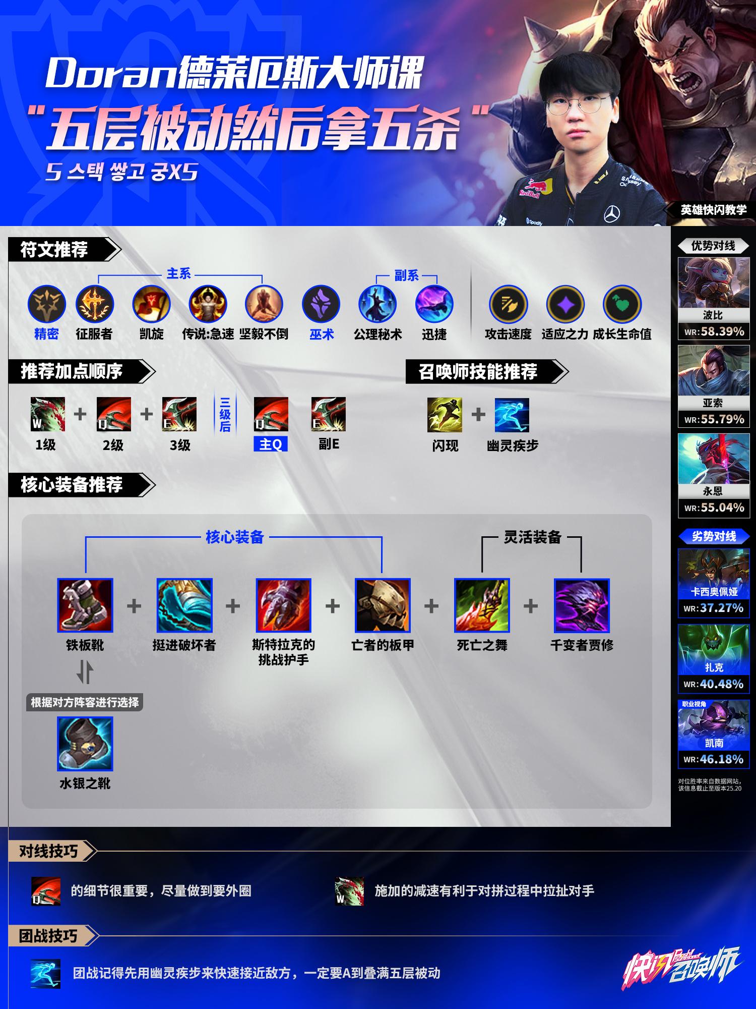 T1.Doran的「诺克萨斯之手德莱厄斯」教你拿捏细节必不可少,减速抡外圈,展现压制力滚雪球,团战注意叠满被动,抓住时机开启疾跑嘎嘎乱鲨。
