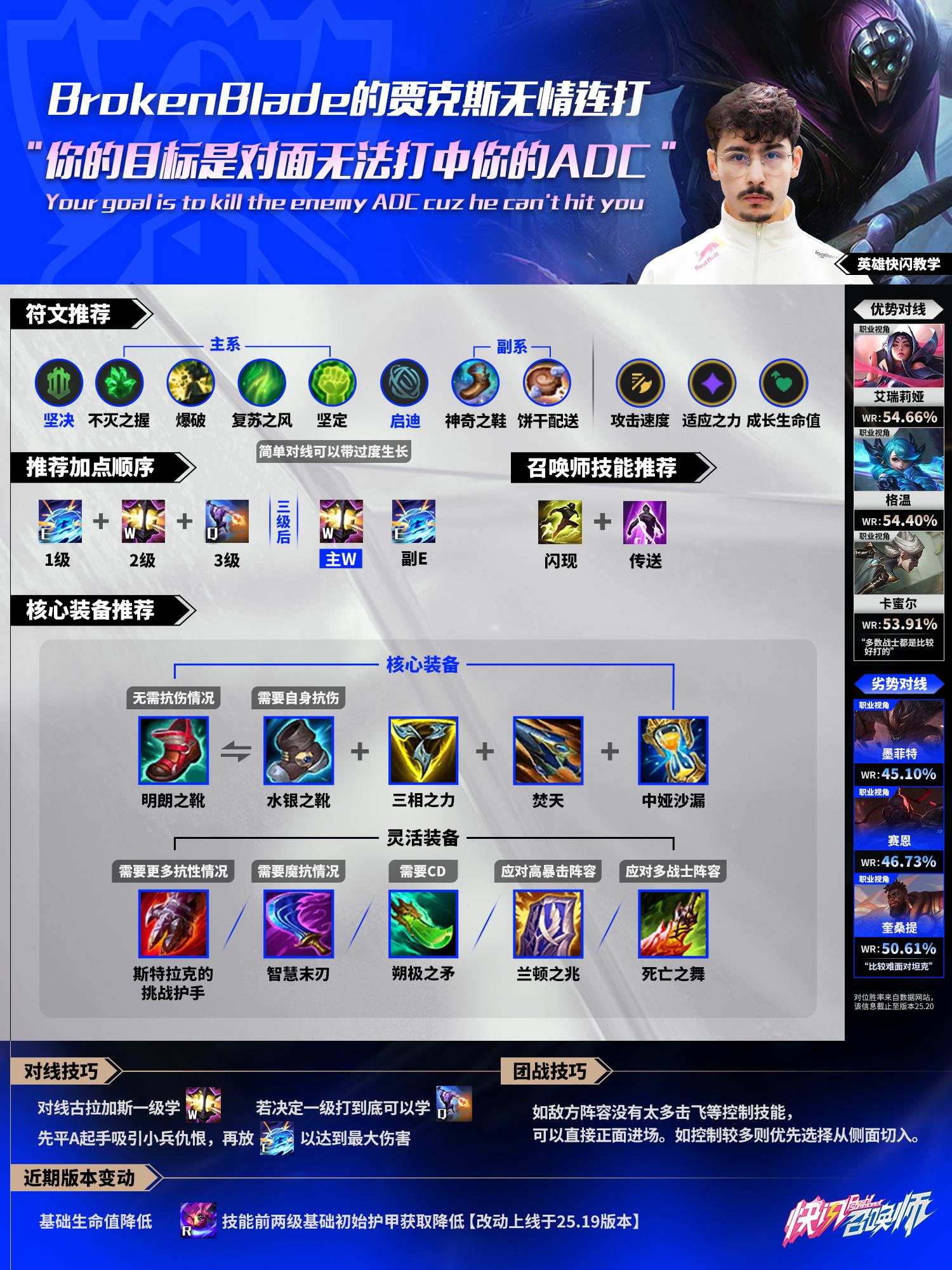 G2.BrokenBlade的「武器大师贾克斯」表示,你看!那是你的目标ADC,现在打开你的“反击风暴”,让他感受满屏“未命中”的美妙,然后狠狠地敲他就行了!