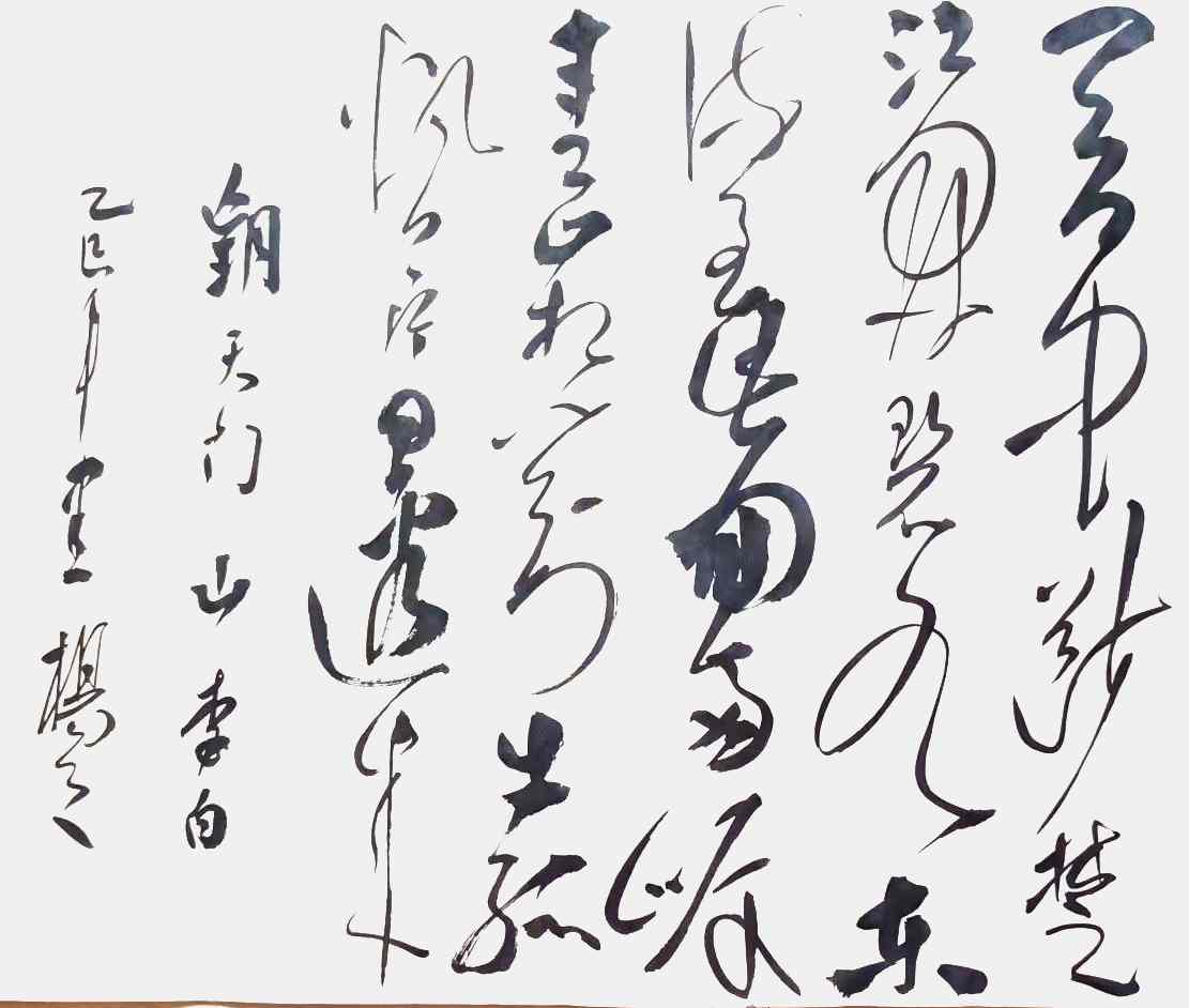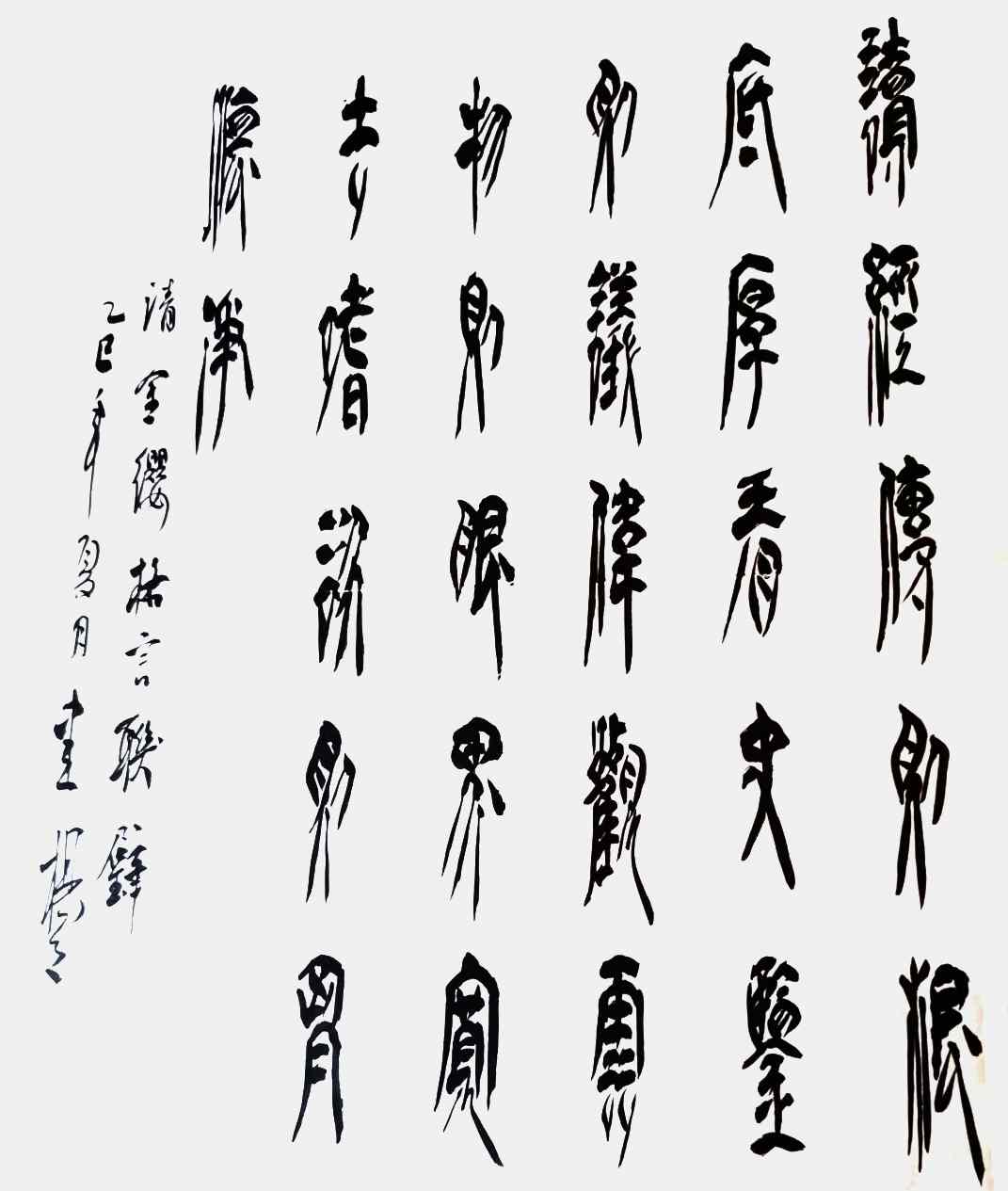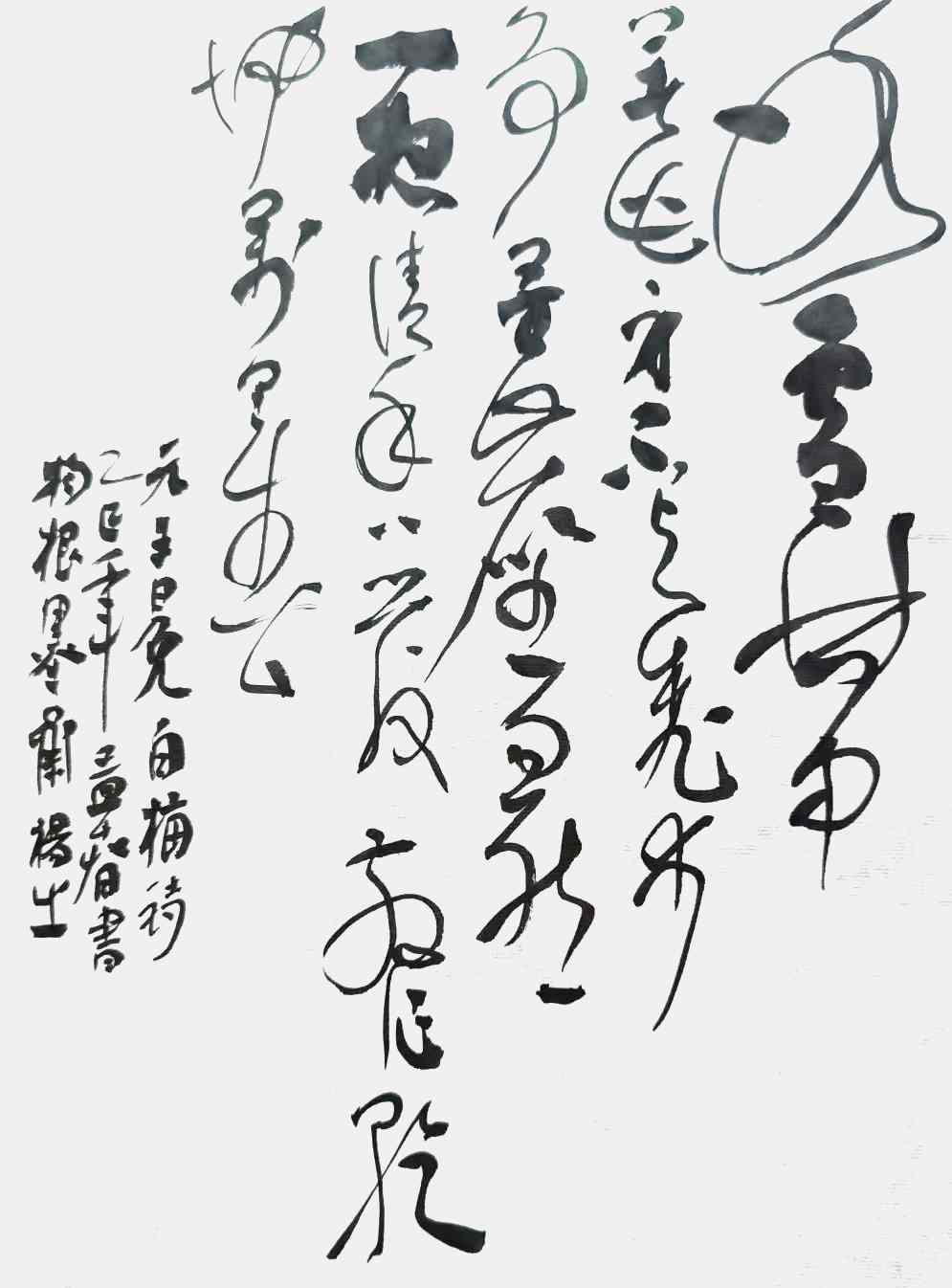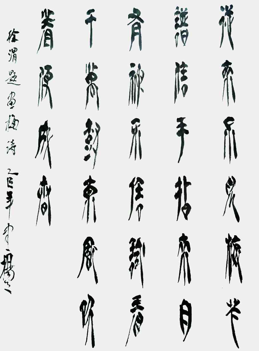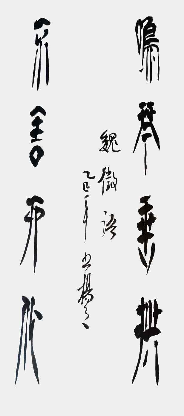 杨茂祥书法最引人瞩目的特色,在于他独创的“象形篆隶”与“象形草书”。这一风格的形成,源于他将根雕艺术的形态与神韵巧妙地融入笔墨之中。他打破了书法与雕塑的界限,将对自然万物的观察与感悟,转化为独特的艺术语言。在他的笔下,字不再是静止的符号,而是充满生命力的动态意象。观其作品《岳阳楼记》选句或《望天门山》,仿佛是在欣赏一幅幅生动的画卷:笔势或如翔龙飞天,或如鲲鹏展翅,或如仙人执杖,或如骏骥奔腾。他善于通过加长线条、变化线条的方式,强化字体的纵逸之态与视觉冲击力。这种“以形写神”的创意,并非无源之水的臆造,而是建立在扎实的传统功底之上,既有甲骨文、鸟虫篆的坚实根基,又融入了“颠张醉素”的狂态与黄庭坚的飘逸,最终形成了一种兼具具象之美、意象之韵与抽象之趣的独特风格。