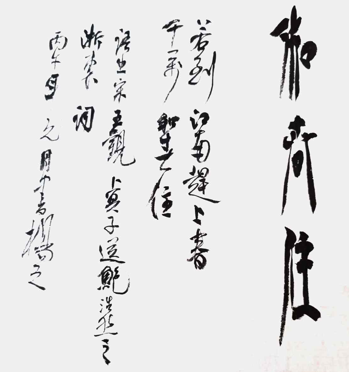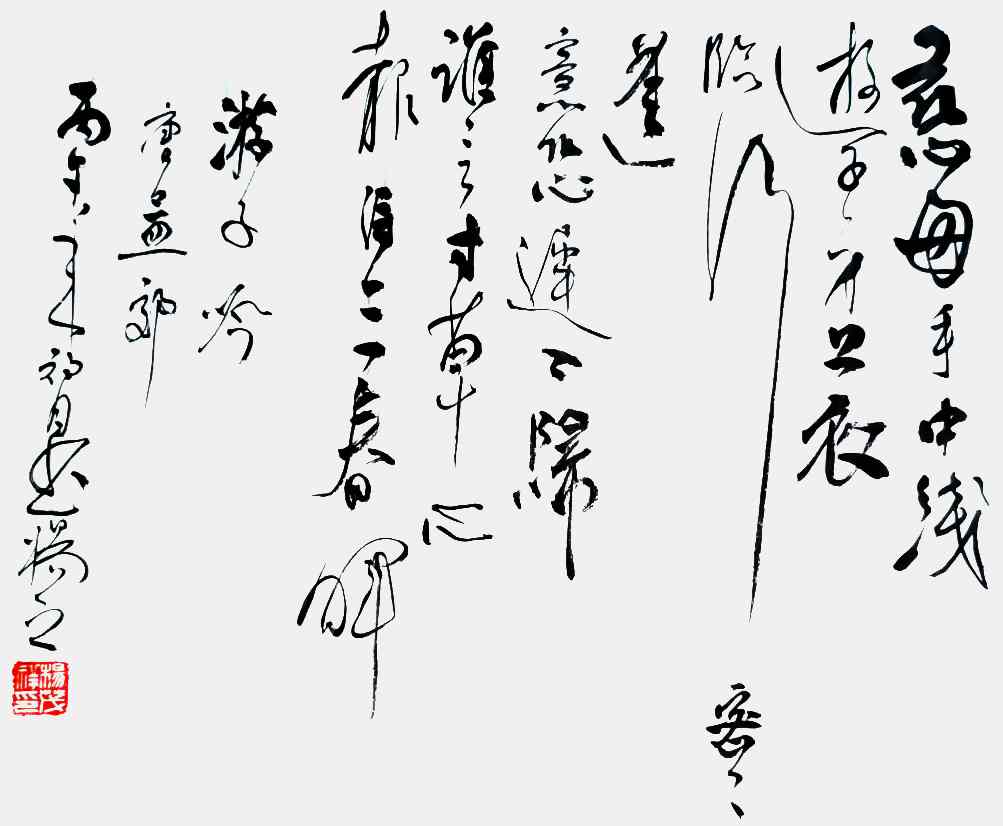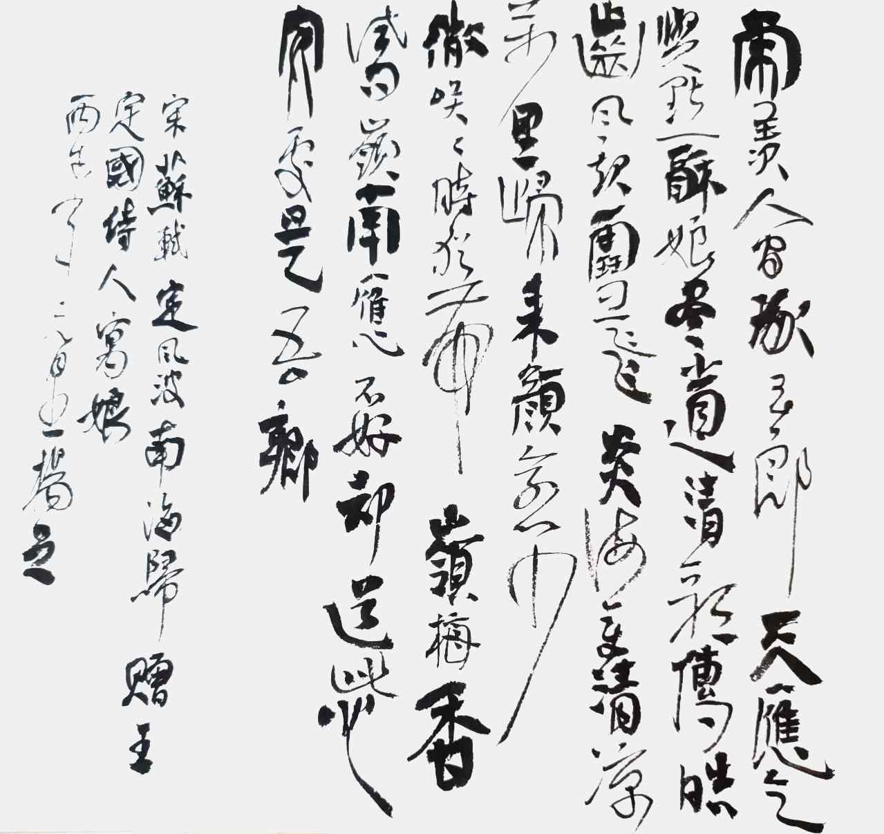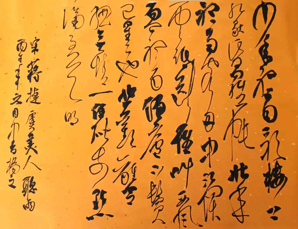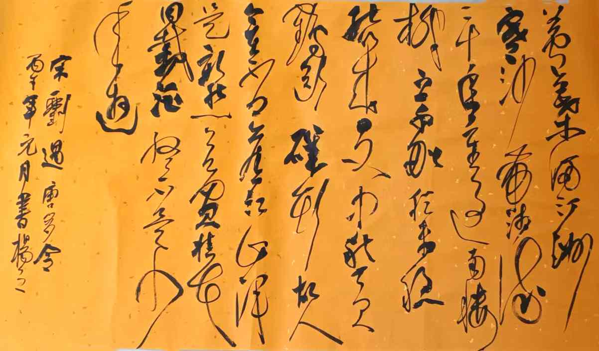 杨茂祥书法最引人瞩目的特色,在于他独创的“象形篆隶”与“象形草书”。这一风格的形成,源于他将根雕艺术的形态与神韵巧妙地融入笔墨之中。他打破了书法与雕塑的界限,将对自然万物的观察与感悟,转化为独特的艺术语言。在他的笔下,字不再是静止的符号,而是充满生命力的动态意象。观其作品《岳阳楼记》选句或《望天门山》,仿佛是在欣赏一幅幅生动的画卷:笔势或如翔龙飞天,或如鲲鹏展翅,或如仙人执杖,或如骏骥奔腾。他善于通过加长线条、变化线条的方式,强化字体的纵逸之态与视觉冲击力。这种“以形写神”的创意,并非无源之水的臆造,而是建立在扎实的传统功底之上,既有甲骨文、鸟虫篆的坚实根基,又融入了“颠张醉素”的狂态与黄庭坚的飘逸,最终形成了一种兼具具象之美、意象之韵与抽象之趣的独特风格。