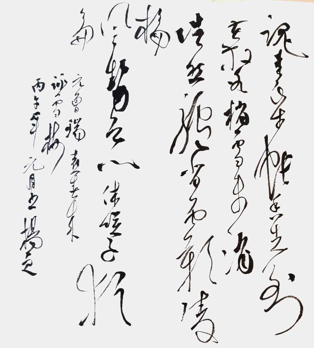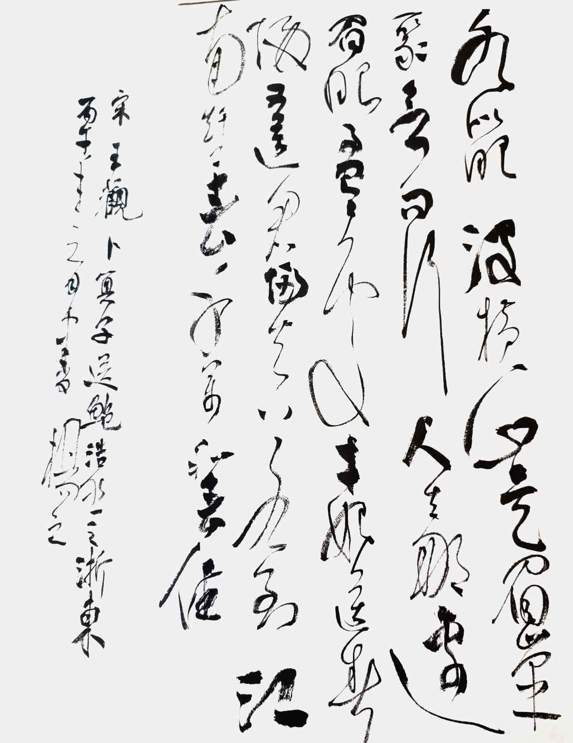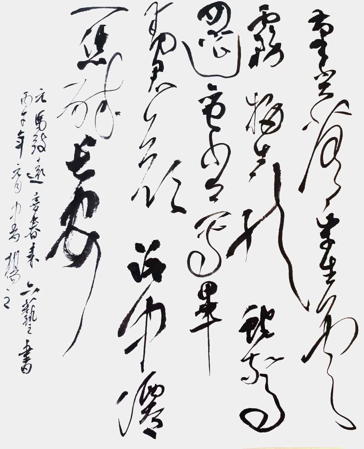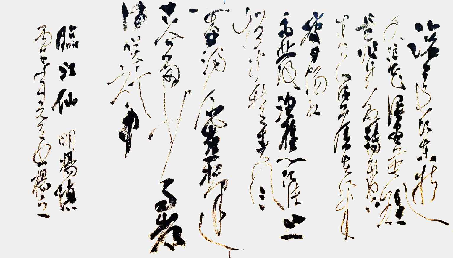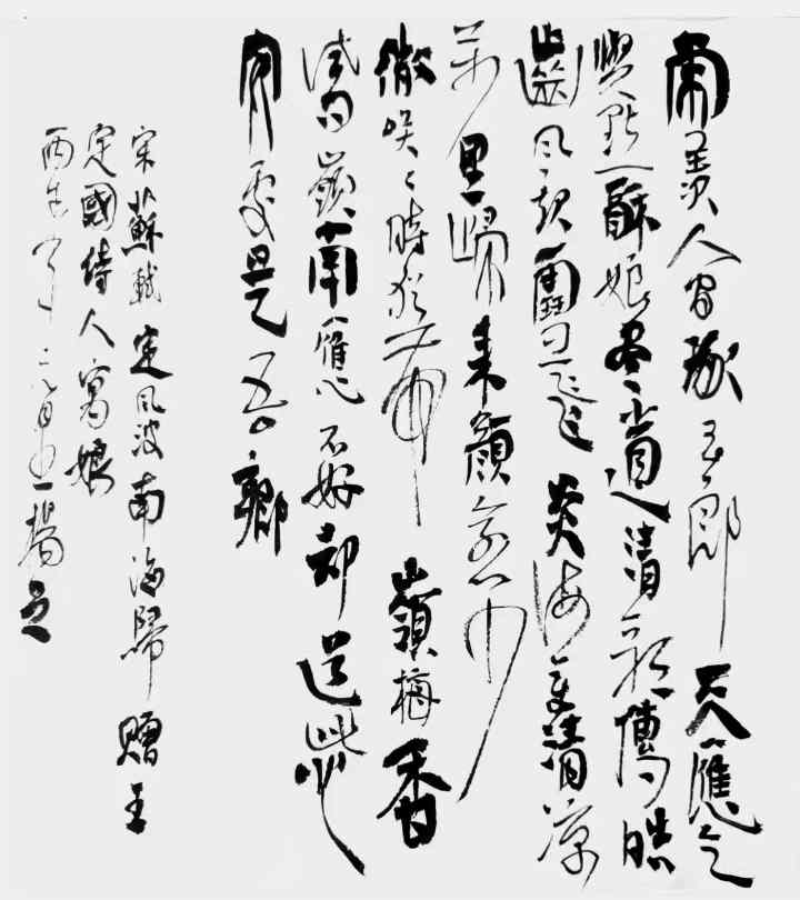 杨茂祥书法最引人瞩目的特色,在于他独创的“象形篆隶”与“象形草书”。这一风格的形成,源于他将根雕艺术的形态与神韵巧妙地融入笔墨之中。他打破了书法与雕塑的界限,将对自然万物的观察与感悟,转化为独特的艺术语言。在他的笔下,字不再是静止的符号,而是充满生命力的动态意象。观其作品《岳阳楼记》选句或《望天门山》,仿佛是在欣赏一幅幅生动的画卷:笔势或如翔龙飞天,或如鲲鹏展翅,或如仙人执杖,或如骏骥奔腾。他善于通过加长线条、变化线条的方式,强化字体的纵逸之态与视觉冲击力。这种“以形写神”的创意,并非无源之水的臆造,而是建立在扎实的传统功底之上,既有甲骨文、鸟虫篆的坚实根基,又融入了“颠张醉素”的狂态与黄庭坚的飘逸,最终形成了一种兼具具象之美、意象之韵与抽象之趣的独特风格。
