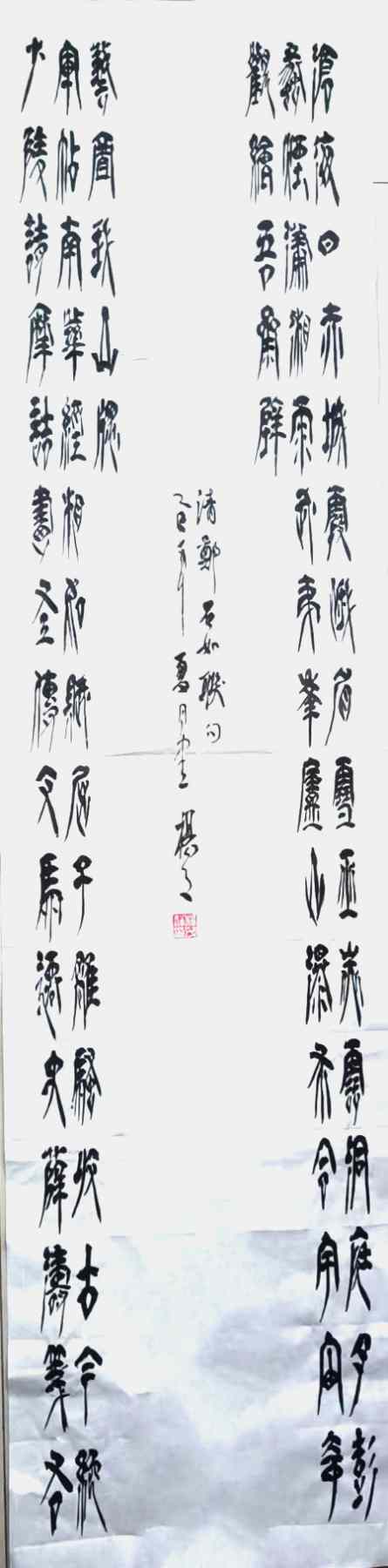 In the realm of calligraphy, Yang Maoxiang has been systematically studying and exploring since 1991, mastering the five styles of calligraphy: regular script, cursive script, seal script, official script, and running script, each with its own strengths and intertwined characteristics. He emphasizes adhering to the traditional style and never deviating from the orthodox, combining the strength of the inscriptions on steles and the elegance of calligraphy practice in his brushwork. His running and cursive scripts exhibit rich variations in style, while his seal script is simple, elegant, and robust. In 2018, he founded his unique "Yang Style" calligraphy, which has now become a mature system. His works, such as selected passages from "Notes on Yueyang Tower" and "Looking at Tianmen Mountain," feature pictographic seal and official scripts as well as pictographic cursive scripts, blending tradition and innovation to showcase a powerful momentum and the light of the times.
