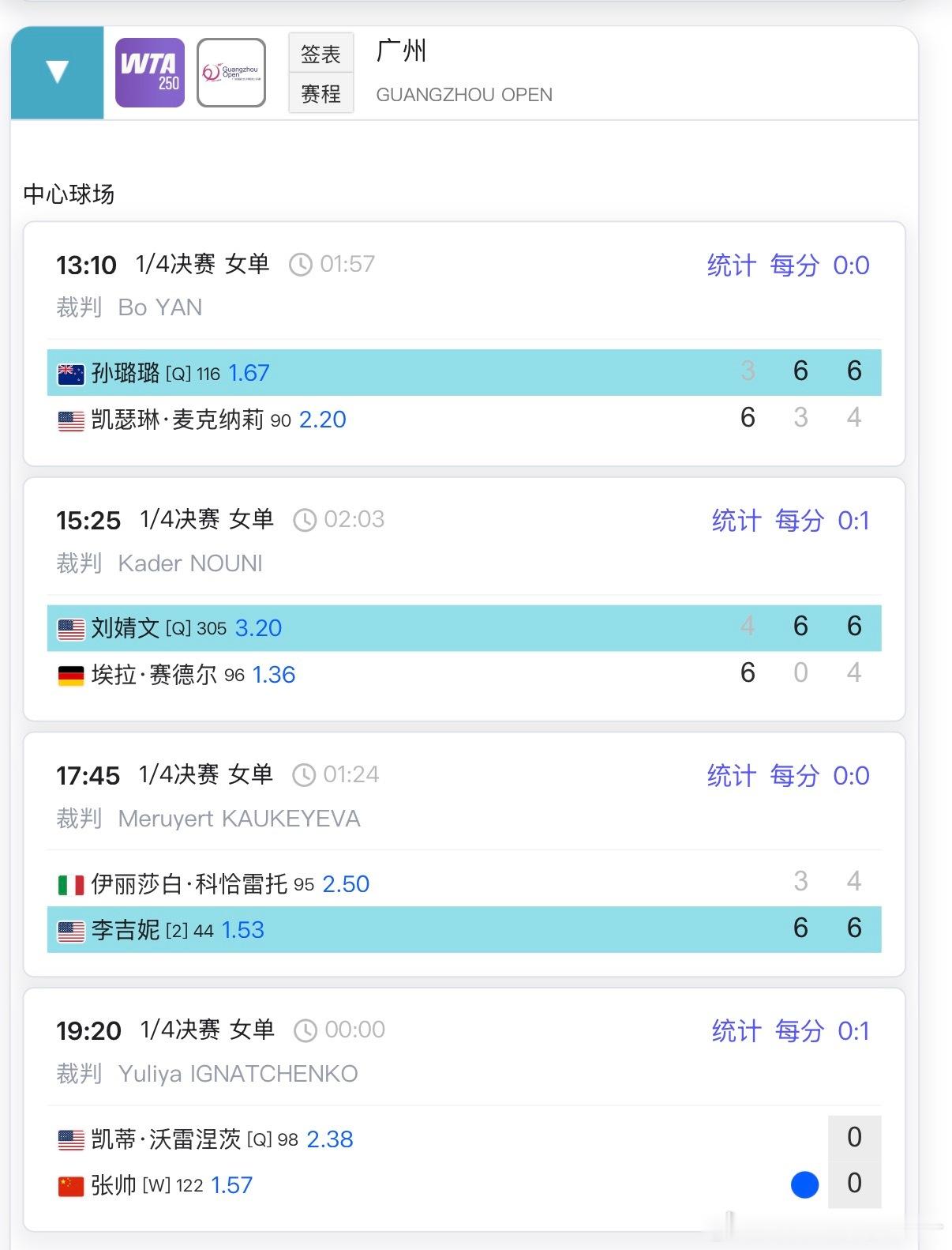 🇳🇿孙璐璐、🇺🇸刘婧文、🇺🇸李吉妮已经晋级广州女单四强🇨🇳张帅加