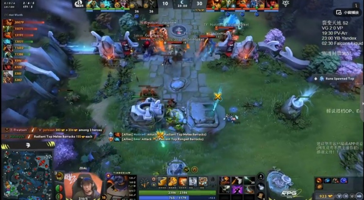 [26分钟]上路Emo蓝猫收线直接被Yandex反蹲,一个紫苑完成逮捕!双方经济差来到14K!Yandex直接上高先拆YB上路高地!YB想秒影魔但是被Noticed马尔斯BKB框大,奶绿子弹输出全打墙上了啊!这波YB双酱油倒下,随后Emo蓝猫下高地再次被逮捕,poloson沉默买一送一!Yandex再拆中路高地!