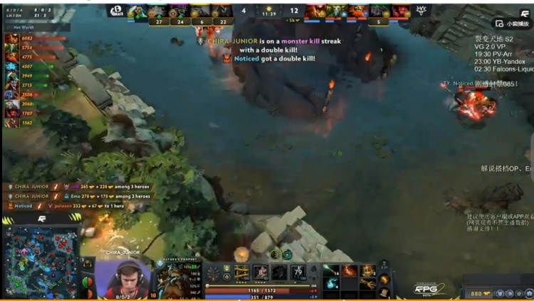 [11分钟]河道遭遇,YB集火强杀Malady杰奇洛,但是Emo蓝猫又被打到残血,最终被CHIRA_JUNIOR先知追死,正面伐木机+沉默强行换残血影魔失败,这波Yandex打出1换4,双方经济差6K了!