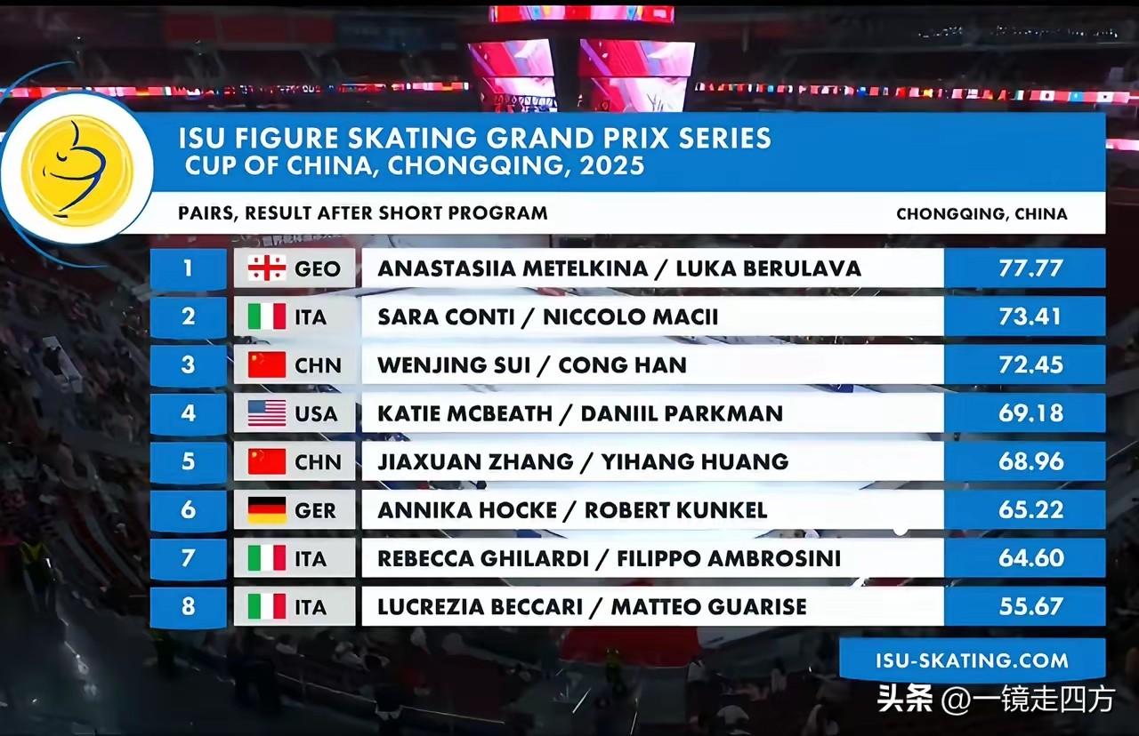 在重庆举行的中国杯世界花样滑冰大奖赛迎来一对久别的名将,这就是阔别赛场三年后复出的北京冬奥会双人滑冠军隋文静和韩聪,两位年龄都已超过30岁的老将虽然在短节目比赛的表现不够完美,隋文静出现了摔倒,但还是以72.45分暂列第三,另一对中国组合张嘉轩/黄一航暂列第五,刷新了赛季最佳,今年世青赛冠军、格鲁吉亚组合梅特尔基娜/别鲁拉瓦以77.77分暂列第一。