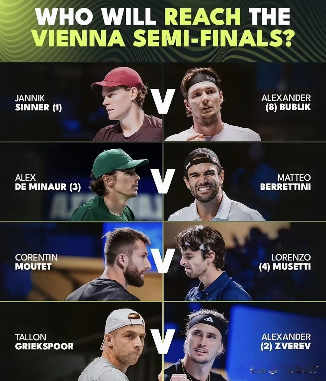 ATP500维也纳公开赛波澜不惊,前四号种子选手成功会师四强,半决赛将是辛纳对阵德米纳尔,兹韦列夫对阵穆赛蒂,辛纳将继续冲击个人赛季第四冠。