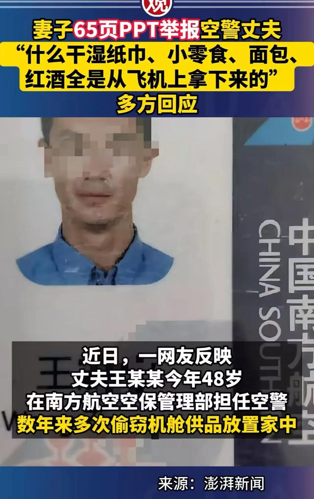 妻子65页PPT举报空警丈夫,数年来多次偷窃机舱供品放置家中!妻子:“干湿纸巾、小零食、面包、红酒全是从飞机上拿下来的,认为不拿白不拿”。网友:一个人枕边人只能挖到这点黑料,这个人在空乘行业真的太干净了! 这个事件引发了网友的广泛关注和讨论。根据妻子的举报,她发现丈夫多年来多次从飞机机舱中偷取供品,放在家中,包括干湿纸巾、小零食、面包和红酒等。妻子表达了对丈夫行为的失望,认为这些东西都是从飞机上带下来的,觉得“不拿白不拿”。 网友对这件事的反应多为震惊和质疑,有人认为丈夫作为空乘人员,平时可能会有更多接触和便利条件,但也有人觉得,无论出于什么原因,偷窃行为都不应该被容忍。评论中有人提到:“一个人枕边人只能挖到这点黑料,这个人在空乘行业真的太干净了!”似乎是在质疑丈夫在工作中的操守,强调其职业形象应当纯洁。 此事反映了家庭伦理和职业道德的双重问题,也引发公众对空乘行业规范和个人行为的关注。对于事件的真实性和细节,仍需要进一步核实信息。