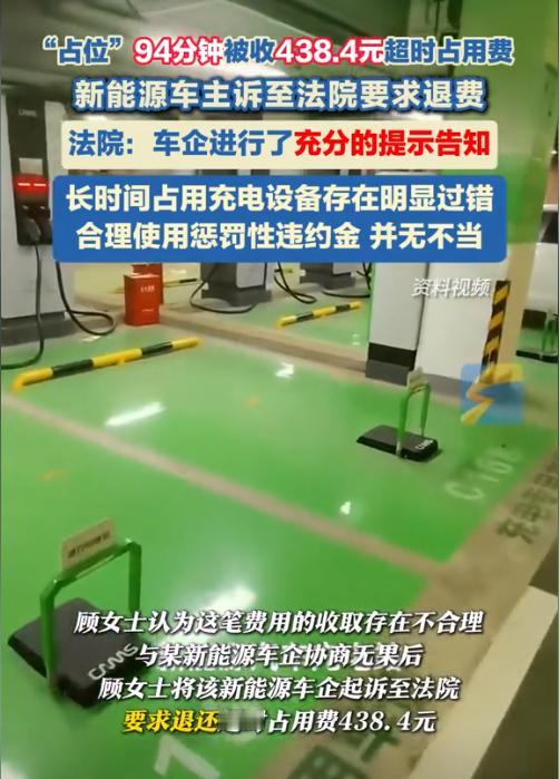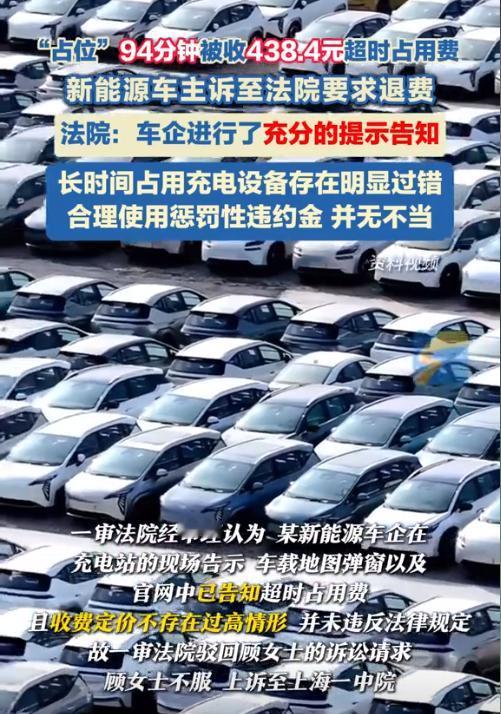 “真是无语了”。10月23日,上海,一女子在公共充电桩给车辆充电后,没有及时挪走,结果被收了438.4元的超时占用费,自己充电才花了108元,认为车企收取超时占用费不合理,而且车企也未进行超时提醒,于是起诉车企要求退还超时费,可结果却大大超出了女子的预料。[礼物] 新能源车主顾女士最近遇到一件烦心事,她在充电站完成充电后,因未能及时挪车,94分钟后被收取了438.4元超时占用费,而实际电费仅108.45元,认为收费不合理的她将车企告上法庭,但最终败诉。 上海市第一中级人民法院在二审中维持了原判,法院查明,该车企通过官网、车机屏幕和手机APP等多个渠道,明确公示了超时占用费的收取标准。 顾女士此前已有多次超时记录,还曾享受过首次免单的优惠,显然对规则是知情的。 这起案件的争议焦点在于超时费的性质,法律上它被视为违约金,主要目的是督促车主及时腾出充电位,提高公共资源利用率。 该车企的设置也体现了灵活性,当空闲车位超过一半时不收费,且首次超时可免单。 事发时该充电站仅有4个充电桩,期间有多辆车在排队等候,顾女士的超时行为确实影响了其他车主的正常使用,也降低了充电站的运营效率。 目前各新能源品牌的超时费标准不尽相同,特斯拉在车位紧张时按每分钟3.2元或6.4元收取;理想汽车设15分钟宽限期,之后按2元/分钟计费;极氪和蔚来则设置了单次50元的上限。 在使用公共充电设施时需要更加留意相关规则,随着电动车普及率提升,充电资源日益紧张,需要用户和企业共同维护使用秩序。 网友们看了充电站超时费收取标准纷纷评论: “这新闻看得我血压都上来了!顾女士这事儿真是典型的不看规则吃大亏啊,充电108元,超时费438元,乍一看确实肉疼,但仔细想想,充电桩又不是私家车位,你占着茅坑不拉屎,后面排队的人怎么办?法院判得没毛病!” “干得漂亮!最烦充完电赖着不走的人,上次我在商场充电桩排队半小时,前面一辆车早充完了,人跑去吃饭,害得我会议迟到,收超时费才能治这种自私鬼!” “说没提醒的纯属甩锅,现在哪个充电APP不弹窗发短信?她自己都承认开会没看手机,难道要车企打电话喊‘娘娘挪车’吗?” “而且这大姐是惯犯啊!法院查出来她之前就有多次超时记录,还享受过首次免单,典型的占便宜没够,这次踢到铁板了。” “理解收超时费,但每分钟4.6元是不是太高了?比上海中心商圈停车费还贵!车企定价也得讲点良心吧?” “提醒方式确实该优化,很多APP把规则藏在二级页面,现场标识也不清楚,应该像高速收费站那样,提前百米立牌子写明‘超时每分钟X元’!” “建议学学极氪、蔚来,设置50元封顶,惩罚归惩罚,天价收费反而像变相创收。” “这事本质是公共资源争夺战,新能源车越来越多,充电桩却增长缓慢,与其吵架,不如推广‘忙时高价、闲时免费’的弹性收费。” “车主和车企都有责任,车主得养成充完即走的好习惯,车企也该把提示做得更‘傻瓜式’,比如超时前APP自动响警报。” “最后夸夸法院判决!用案例明确了两点,明码标价的电子协议有效,公共资源效率优先,以后谁再霸位,就有法可依了。” 对于充电站超时费的收取标准,您有什么看法?欢迎在评论区分享您的观点。 信源:闪电新闻