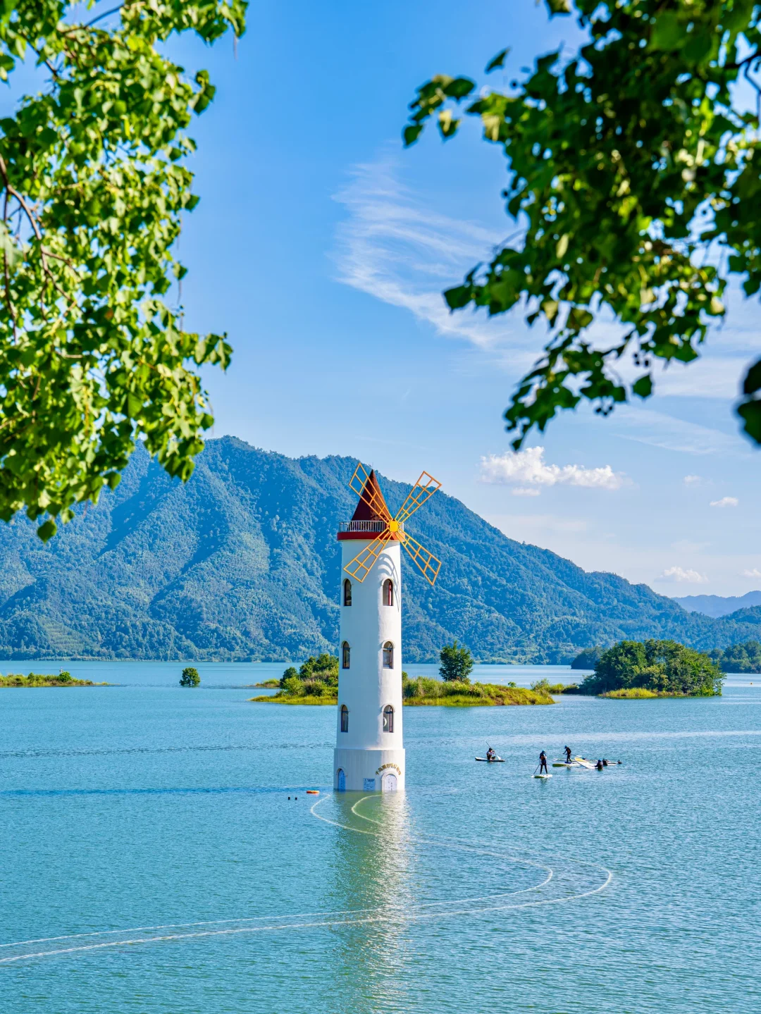 图1️⃣-2️⃣:千岛湖灯塔:网红打卡机位,但是现在栈道被水淹没了,远远拍一张还是不错的