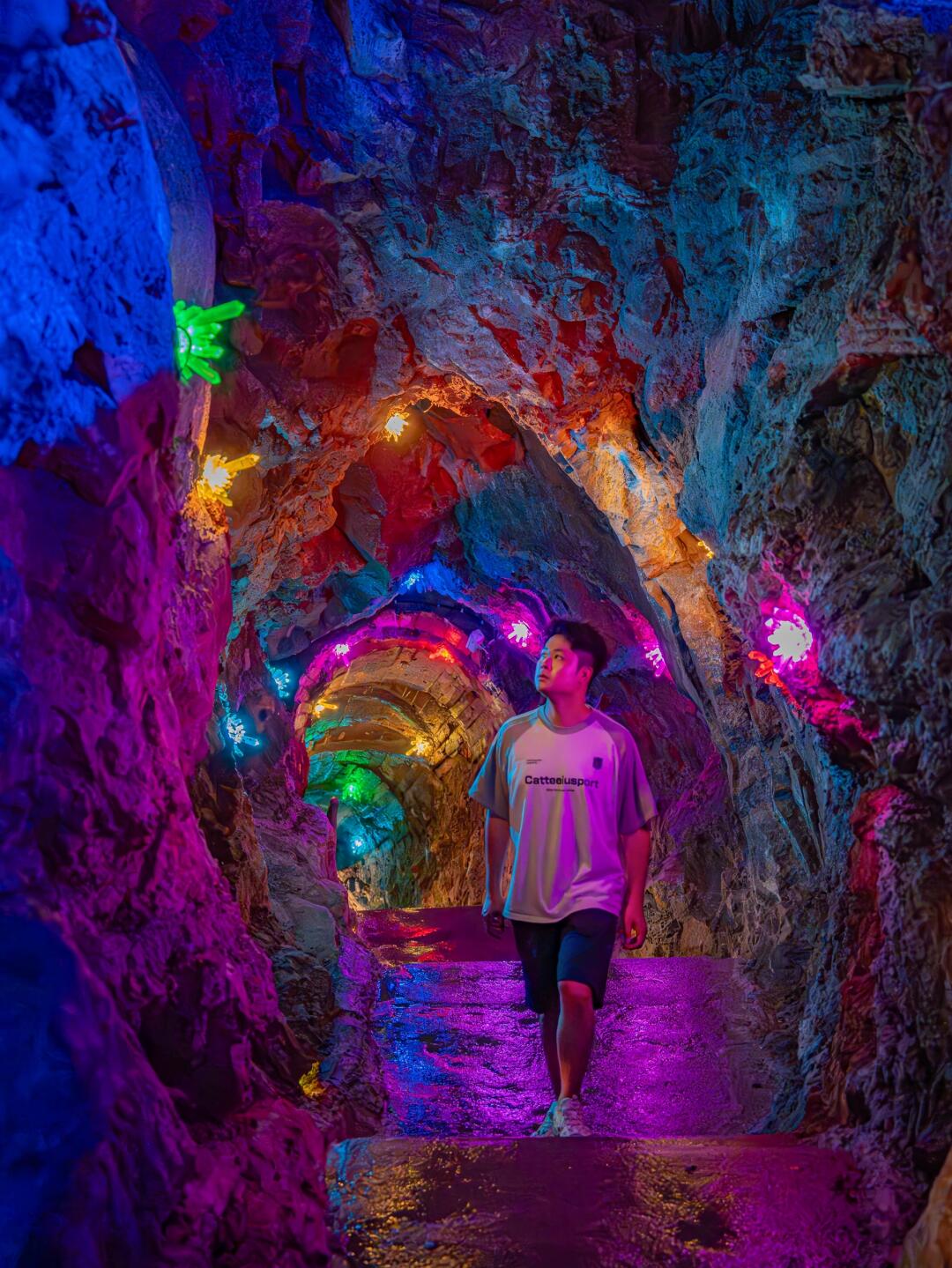 坐船进入,体验感拉满!洞内分「灵泉」「清风」「霭云」三洞,钟乳石千姿百态,灯光映照下超壮观!而且这是86版《西游记》取景地!恒温17度!🔥高温天躲进来简直太爽了!暑假避暑绝佳去处