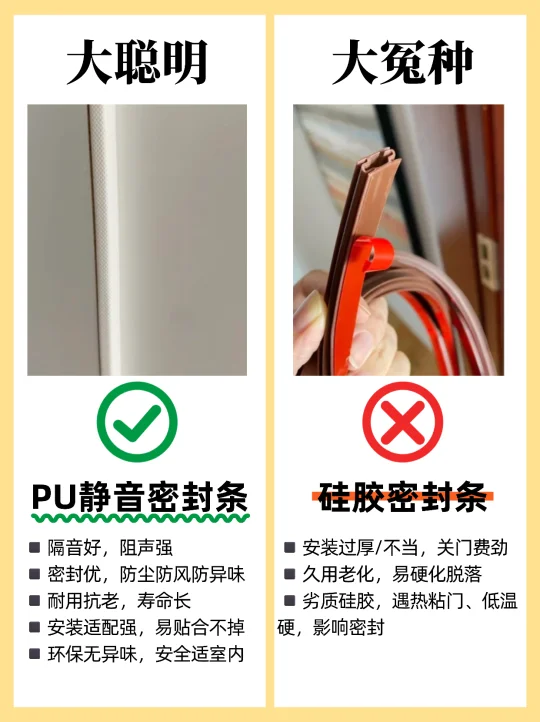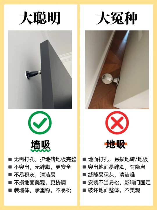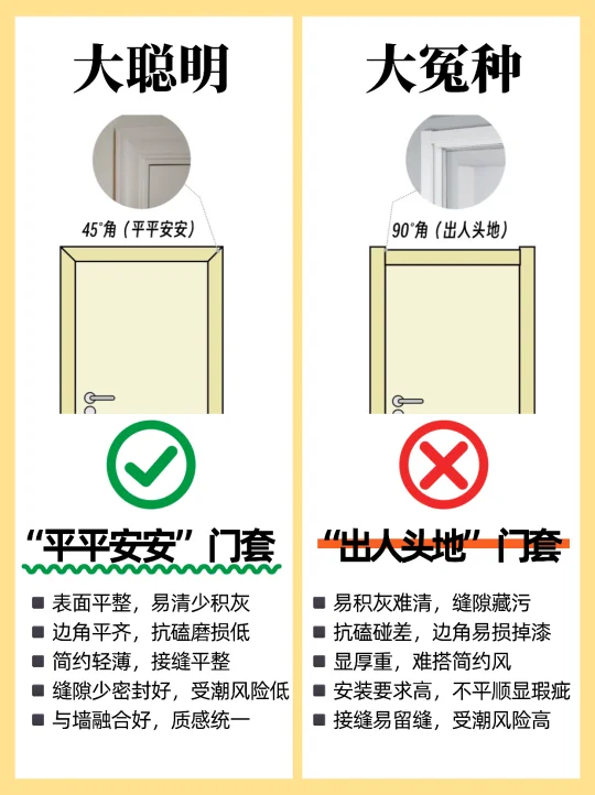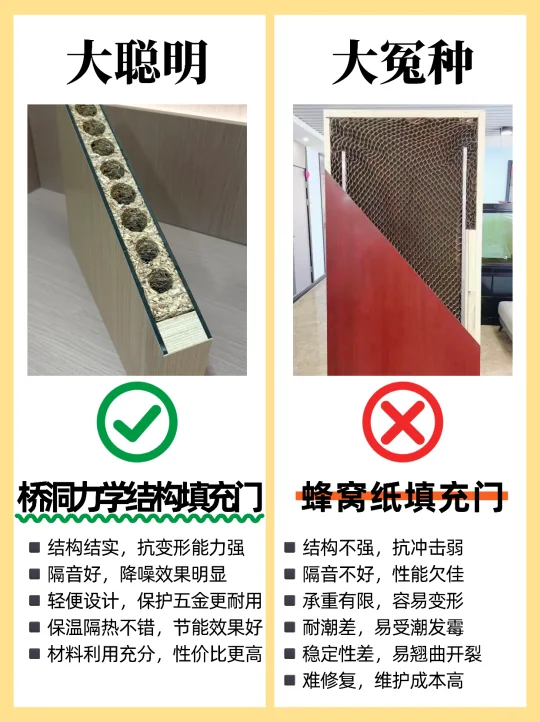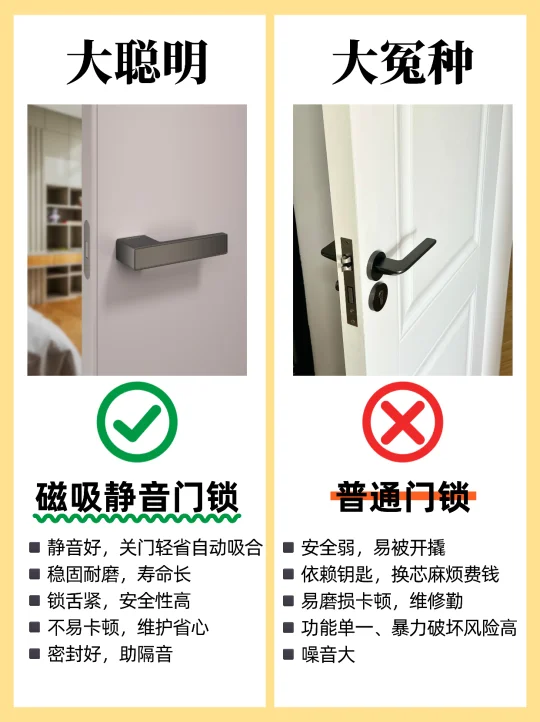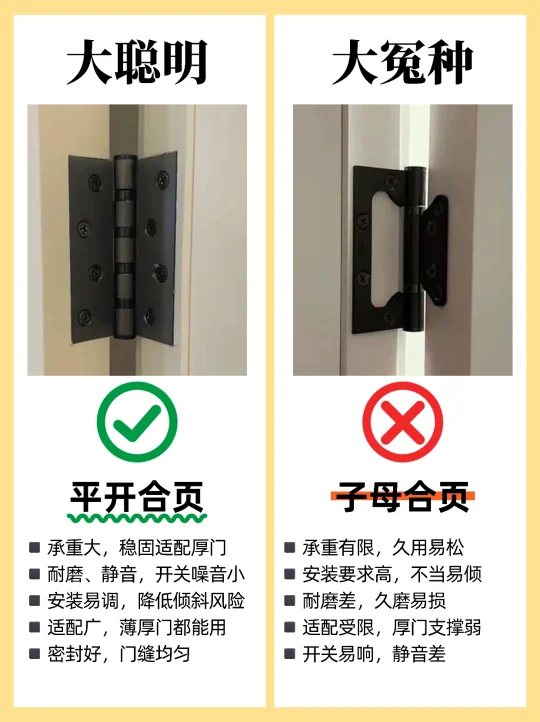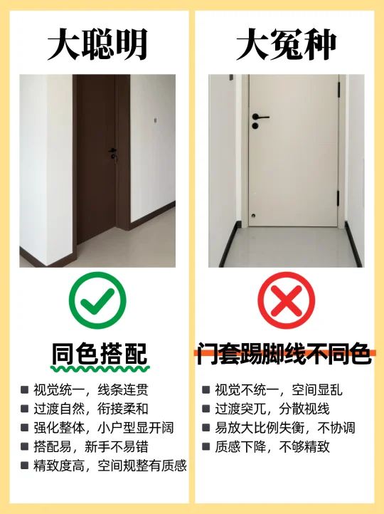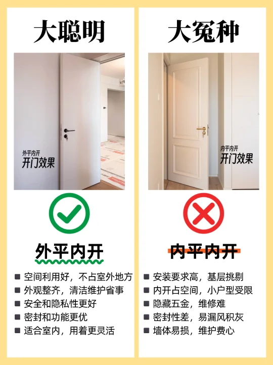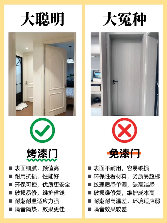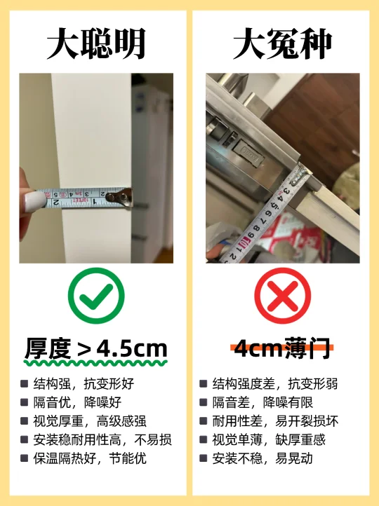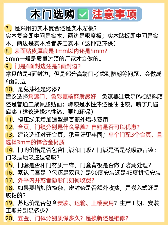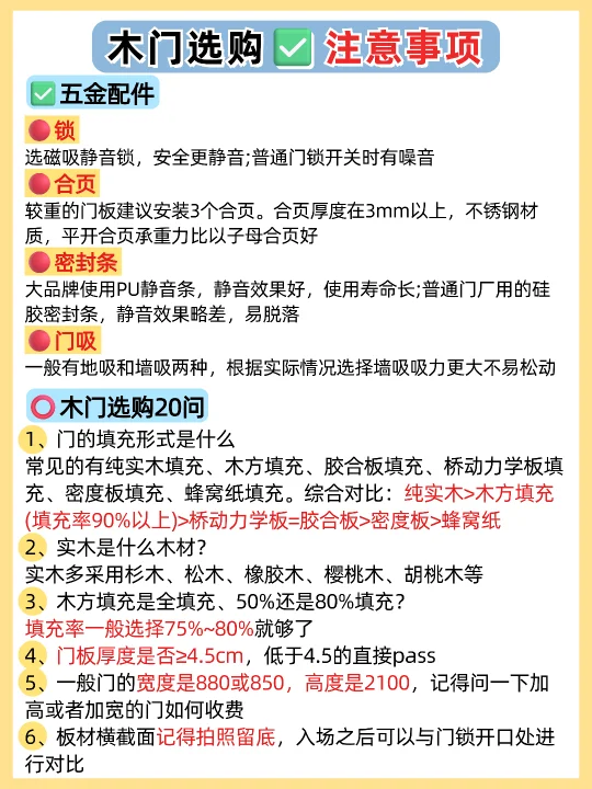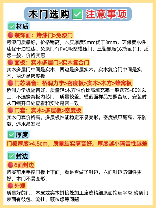 🏠装修选购卧室门,很多人都不知道怎么选,尤其是装修小白,这篇一定要看完,买木门不踩坑! 1️⃣烤漆门✅ 免漆门❌ 2️⃣外平内开✅ 内平内开❌ 3️⃣“平平安安”门套✅ “出人头地” 门套❌ 4️⃣木门厚度>4.5cm✅ 4cm薄门❌ 5️⃣平开合页✅ 子母合页❌ 6️⃣桥洞力学结构填充门✅ 蜂窝纸填充门❌ 7️⃣磁吸静音门锁✅ 普通门锁❌ 8️⃣PU静音密封条✅ 硅胶密封条❌ 9️⃣同色搭配✅ 门套踢脚线不同色❌ 🔟墙吸✅ 地吸❌ - 🟤木门材质 ✔ 装饰面:烤漆门>免漆门 ✔ 面板:实木多层门>实木复合门 ✔ 门芯隔音效果:桥洞力学板>密度板>实木>木方>蜂窝板 ✔ 门套:实木>多层板>密度板 🟢看厚度 门板厚度越小,隔音性越差,选≥4.5cm的,质量结实,隔音好 🔴看工艺 ✔ 6面封边防潮性更好,木门不易变形。 ✔ 质量好的门,木皮或实木拼接处加工痕迹精细,漆面饱满平滑。 🟠看五金配件 ✔ 锁:选磁吸静音锁,安全更静音;普通门锁开关时有噪音。 ✔ 合页:较重的门板建议安装3个合页,平开合页承重力比子母合页好。 ✔ 密封条:大品牌使用PU静音条,静音效果好,寿命长。 ✔ 门吸:一般有地吸和墙吸两种,墙吸吸力更大不易松动。 🔵看价格和售后 ✔ 问清楚报价范围,是否包含锁、合页、门吸、安装费、运输费等。 ✔ 问清楚限宽限高尺寸,超出加多少钱?垭口门套超厚加多少钱?门套不同安装方案是否加钱? ✔ 问清楚安装周期、付款方式和质保时间