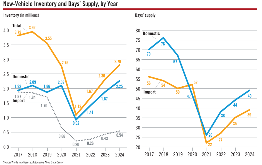 美国的库存目前是在40-50天,总体的库存压力不大,这也是中国车市参考的对象。