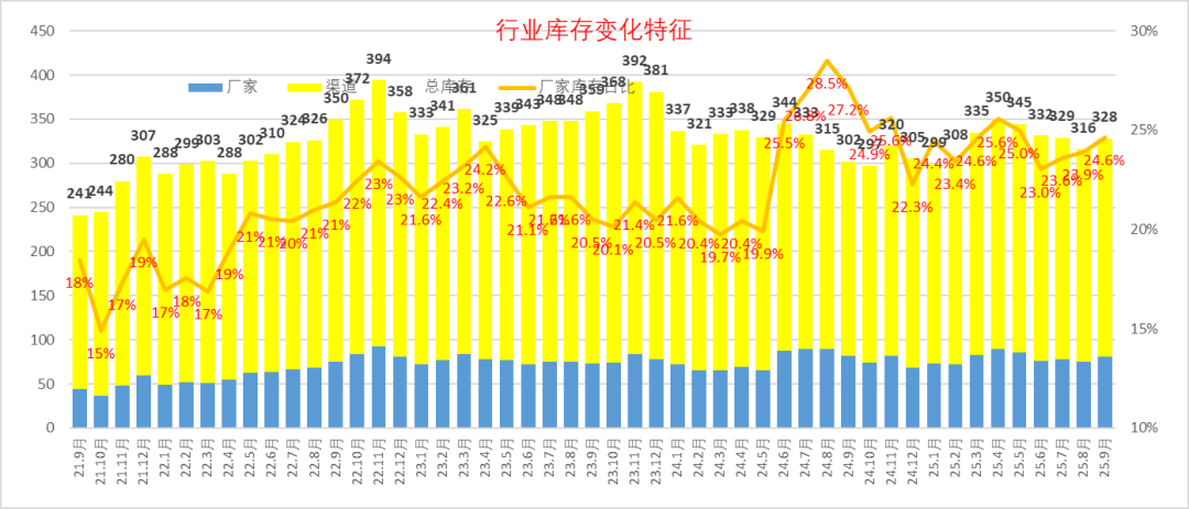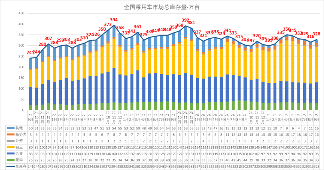 2025年9月月末全国乘用车行业库存328万辆,较上月增12万辆,较2024年9月增26万辆,形成库存回升的旺季备货特征。目前的政策启动带来厂商的总体乐观,以旧换新推动的销量较高,厂家生产相对谨慎。4月行业库存350万辆创出近两年新高,但5-8月的车企相对更理性控制生产,减少对经销商的库存压力,形成5-8月持续去库存,9月库存回升到328万辆的较好走势。
