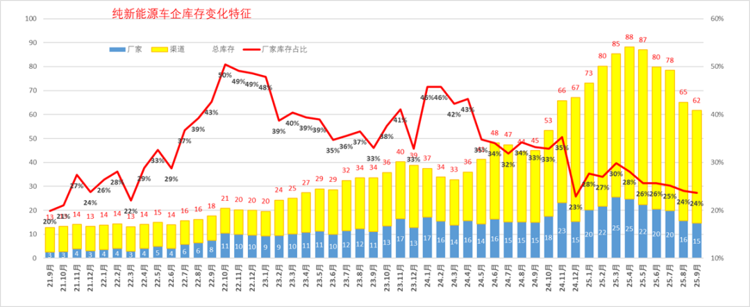 从仅生产新能源车的企业的库存变化特征分析看,2023年年初库存20万辆,年初的库存保持较好,随后进入库存快速增长期,2023年11月末的纯新能源车企总体新能源库存达到40万辆,2024年3月进一步降到33万辆,随后一路上升,2025年4月仅生产新能源车的企业的库存达到88万辆,这是近期的峰值。随着反内卷的推动,行业库存9月降到62万辆,较峰值库存降26万辆,降幅达30%。近期新能源经销商的厂家和渠道库存明显下降,行业库存总体压力稍有改善。