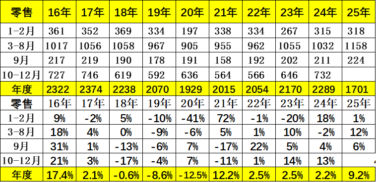 2024年乘用车国内零售前低后高,7-12月出现持续上升态势。2025年车市前低中高特征,1月由于春节前置等因素较弱,今年国内车市零售累计增速从1月的负12%持续拉升到1-6月的11%,7-9月呈现高基数的减速特征,市场走出“前低中高后平”的走势。今年7-9月的零售同比增长平稳,9月在高基数下表现较强。