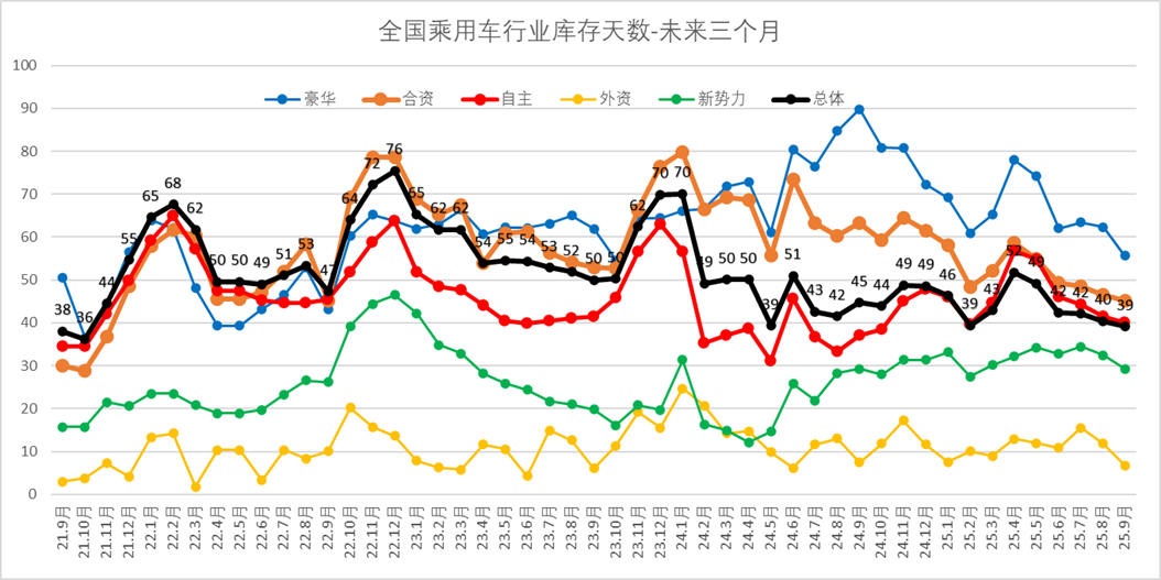 随着2025年市场回暖的如期到来,生产走势较强,前期的去库存的特征改变,4月末的库存天数明显上升,随后反内卷带来行业库存控制。随着中央促消费政策的推动,免税政策的到期预期,各地车展等营销活动活跃,因此我们预测未来几个月厂家总销量相对较好,因此根据2025年9月底的库存与未来销量综合预估的现有库存支撑未来销售天数在39天,相对于2023年9月的50天、2024年9月的45天,今年9月的总体库存压力明显下降。