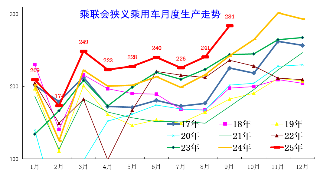 9月乘用车生产284万辆,同比增长17%,环比增长16%。1-9月乘用车生产2073万辆,累计同比增长14%,9月乘用车生产较历史同期高点2023年9月的244万辆高出40万辆,生产走势超强。