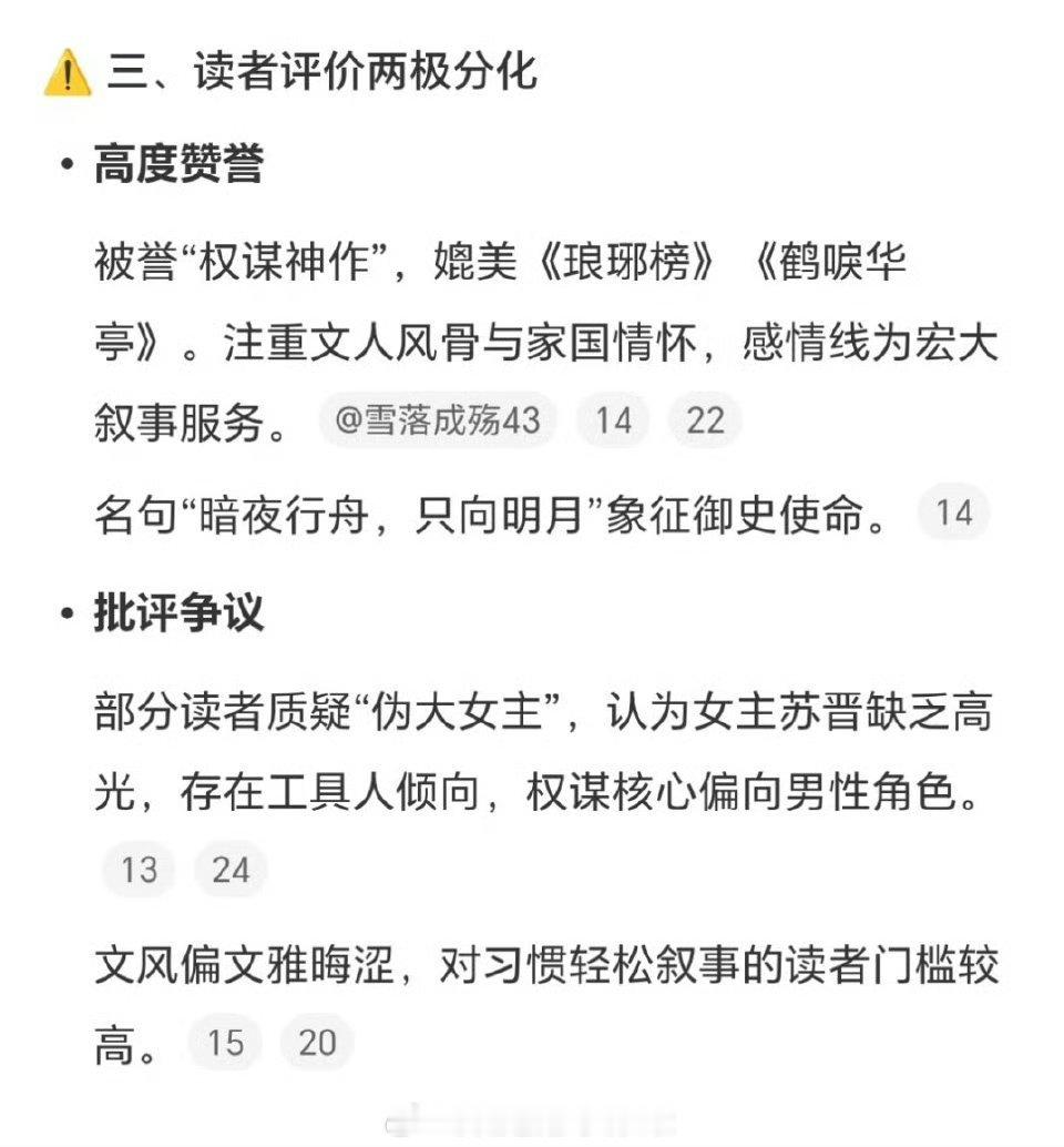 原著剧情风格类《琅琊榜》《鹤唳华亭》,女主女扮男装,周旋与皇子和御史两个人之间,原著有伪大女主的争议,还是男主的权谋剧情更高光