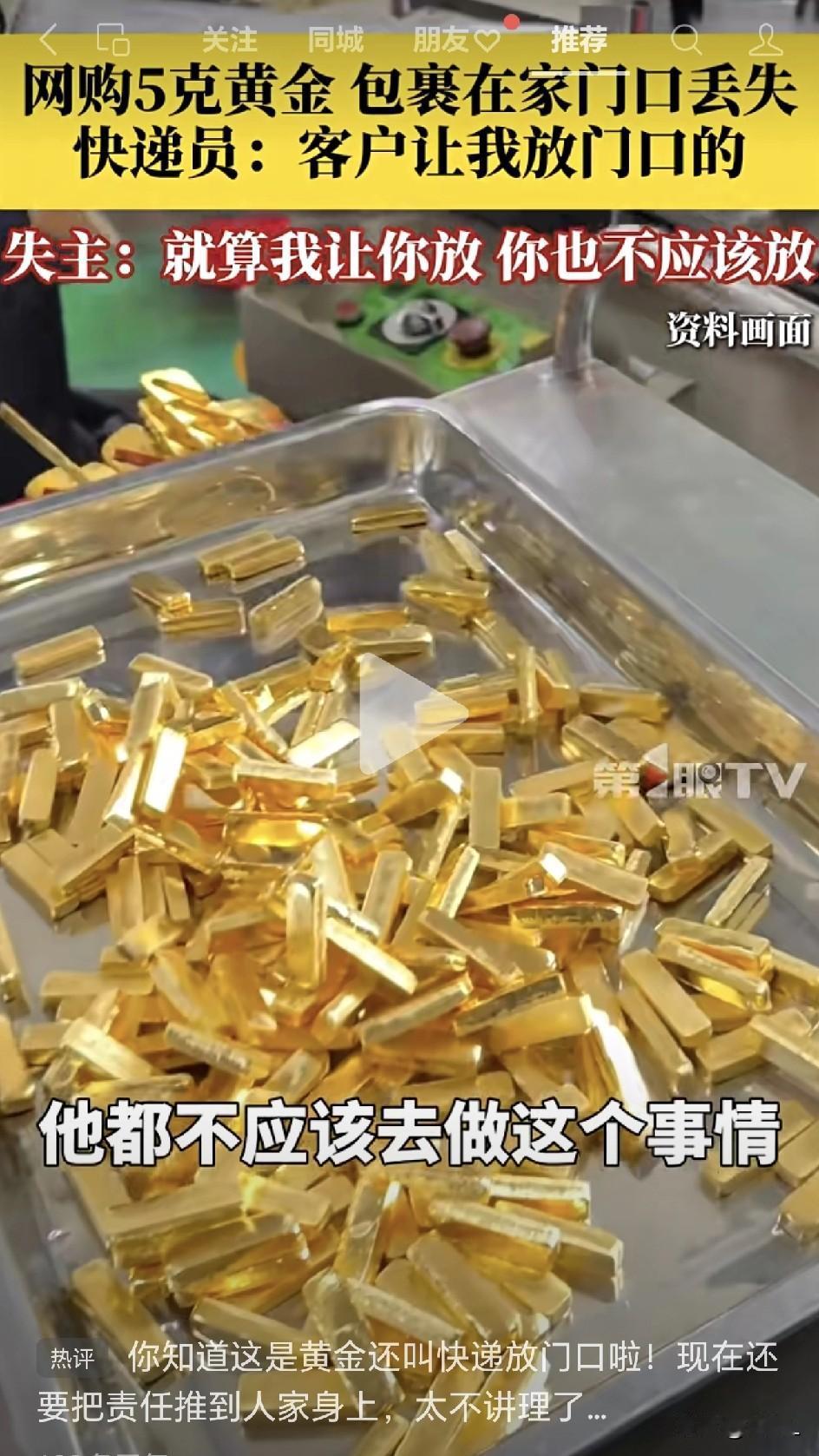 “哪怕我让他放门口,他也不该放!”黄金丢失女子遭全网群嘲,谁该为“巨婴思维”买单? 近日,浙江杭州,肖女士网购了5克黄金。黄金到货后,快递员送货上门时,肖女士并不在家。 当时一共两个快递,一个是黄金,一个是购买的狗粮,肖女士让快递小哥直接放在家门口。 小哥提醒肖女士有个密钥要提供一下,肖女士查看后将密钥告诉了快递小哥。由此,这单快递完成了送达。 没想到的是,肖女士说自己一个小时以后到家,发现装有黄金的那件包裹已经不见了。 监控显示,快递小哥离开楼道时,手里并没有携带装有黄金的包裹。 在肖女士和快递小哥通电话时,快递小哥没有明确说有一个快递是黄金。小哥认为,既然密钥都给了,那自己肯定知道是什么快递。 而肖女士认为,快递面单上提示小哥,这个快递是贵重物品,应该当面交接。 快递员认为,自己第一时间跟客户打电话,也是按照客户的第一要求做的。所以自己没有责任,也拒绝肖女士的赔偿要求。 而肖女士说,快递小哥应该明确告诉自己那单快递是贵重物品,再问自己怎么交接。哪怕自己说了放门口,快递员都不应该这么做。 视频中的评论区,风向基本是一边倒,只怕也是完全出乎了肖女士找媒体爆料的初心: “你知道这是黄金还叫快递放门口?现在还要把责任推到人家身上,太不讲理了。责任应该是你自己。” “哪怕是我要他放门口。他也不应该放门口!这是人说的话吗?” “已经密钥签收,风险就转移了,不服就起诉,想网爆自己就摘口罩!” “人家按你要求做了啊,你凭什么还赖人家?” “你自己同意放门口,你自己都不担心,凭什么让别人为你操心?” “快递员要是不放门口,你是不是得反手一个投诉扣小哥的钱呢?” “自导自演!” “我都怀疑贼喊捉贼。” 事实到底如何,首先从快递小哥的工作流程上,他并没有违规,有录音有监控,可以证明他按照客户的要求完成了快递的投递工作,更没有监守自盗。 所以,快递的丢失,如果非得说快递小哥要担责,也不过是没有反复跟客户强调这是贵重物品,没有硬性劝说下客户当面交接。 但就像网友说的,快递员真的非要客户当面交接,客户会不会反手一个投诉还真说不定。 不过呢,出现快递丢失的事情,不是应该立刻报警的吗?不找警察单纯依靠舆论来分辨是非吗? 具体如何,还要等待事情的后继发展,让子弹再多飞一会。 信息来源于第一眼新闻,侵联删!