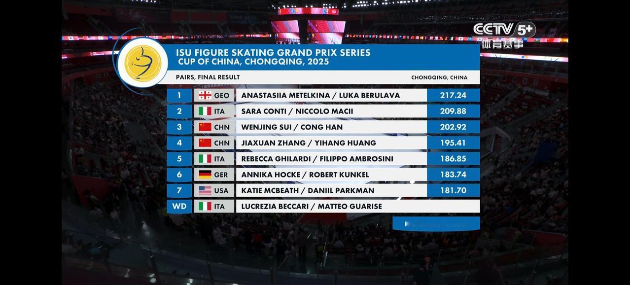 葱桶组合复出首秀获得铜牌!花样滑冰大奖赛中国站,北京冬奥会金牌得主中国组合隋文静/韩聪在休战几年后正式复出,以202.92分获得本站铜牌。金牌和银牌分别被格鲁吉亚和意大利组合获得。另一对中国组合张嘉轩/黄一航获得第四名。应该说这对老将久别赛场那么久,还能进前三已经很不错了,看得出韩聪托举还是比较吃力的。这几个月再努力恢复一下,争取米兰冬奥会上领奖台吧,卫冕应该比较难了,大家降低期望就可以了。